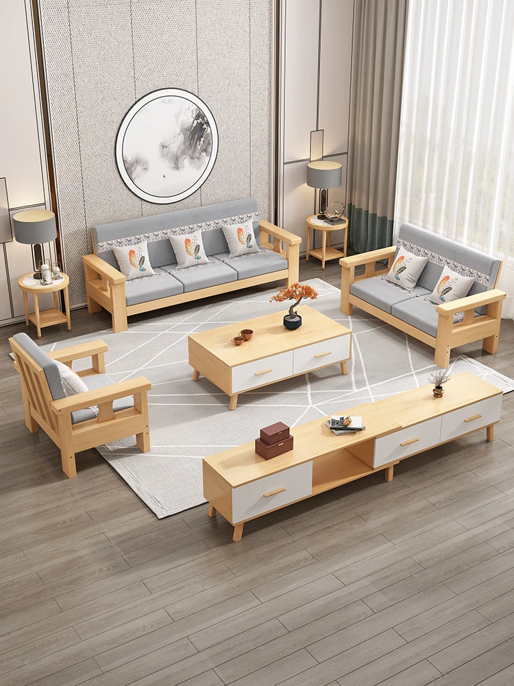 Modern Minimalist Solid Wood Sofa, Coffee Table, and TV Cabinet Set for Small Spaces - Stylish 3-Seater or 4-Seater Combination for Home Use
