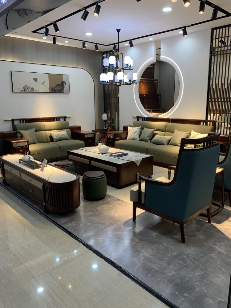 New Chinese Style Black Gold Wood Genuine Leather Sofa - Villa Slim Waist Design Luxury Living Room Top-Grain Leather Sofa Set