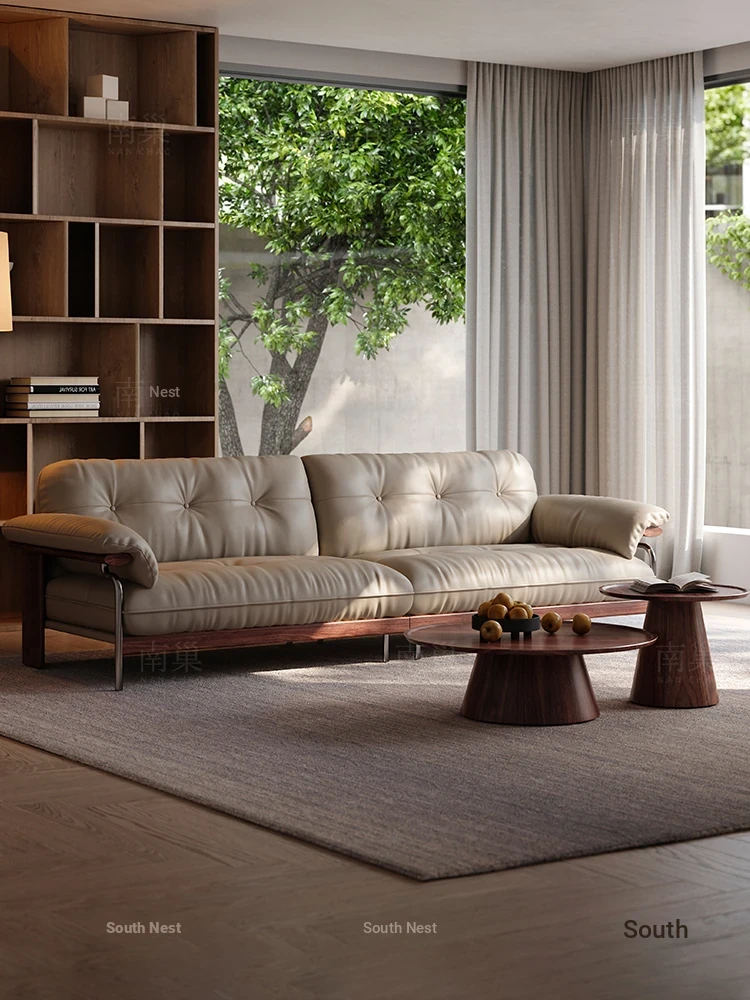 Modern Minimalist Solid Wood Sofa in North American Black Walnut with Genuine Leather – Perfect for Small Living Rooms and Villas