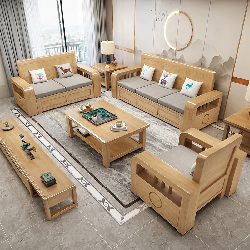 New Chinese Style Solid Wood Sofa Set for Small Spaces - Economical Design with Drawers, Versatile for Winter and Summer, Perfect for Living Rooms, Available in Single, Double, and Three-Seater Options.