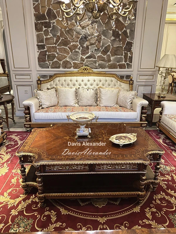 Elegant European and American Classic Villa Furniture - FW96-9 Solid Wood Sofa with Long Coffee Table and Small Square Table, Perfect for Stylish Living Spaces!