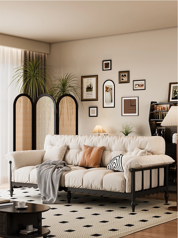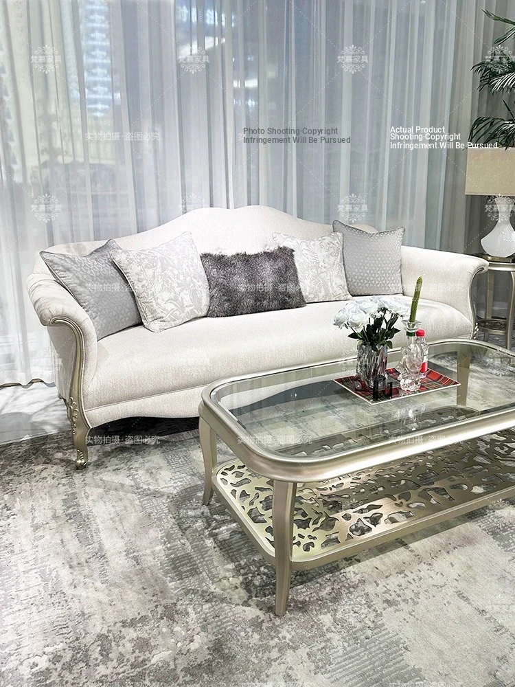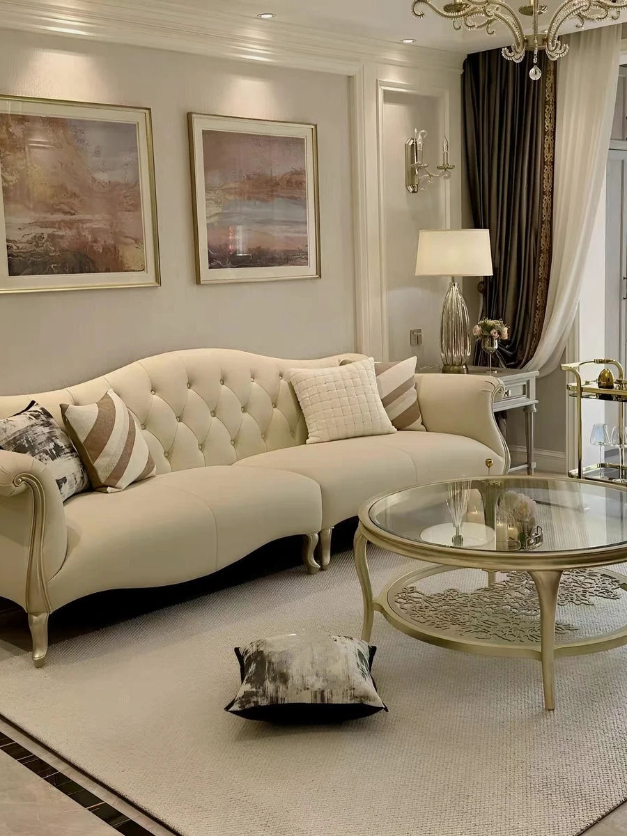 American Style Light Luxury Solid Wood Fabric Sofa - Modern Cream Minimalist French Living Room Sofa with Straight Row and Pull Buckle Assembly