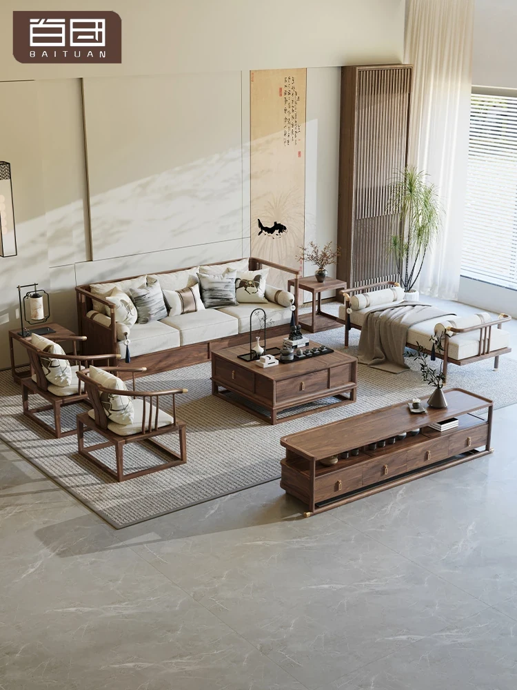 Premium North American Black Walnut Solid Wood Sofa Set - Elegant Zen Style Furniture for Spacious Villas and Cozy Apartments, Perfect for Chinese-Inspired Living Rooms.