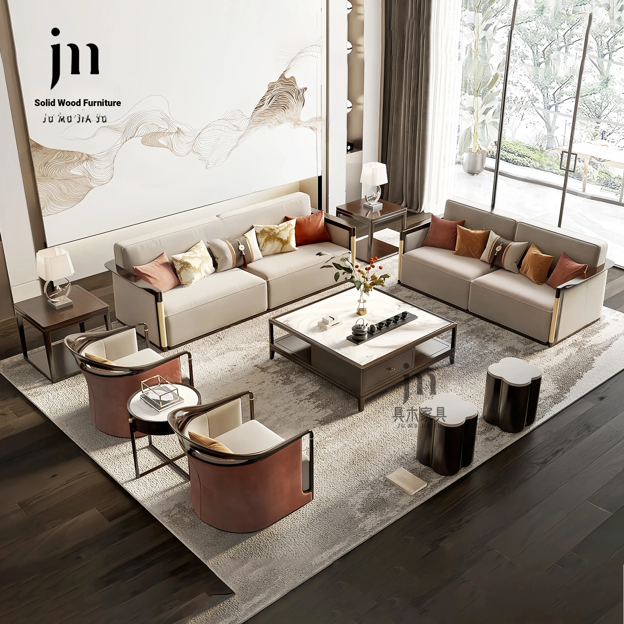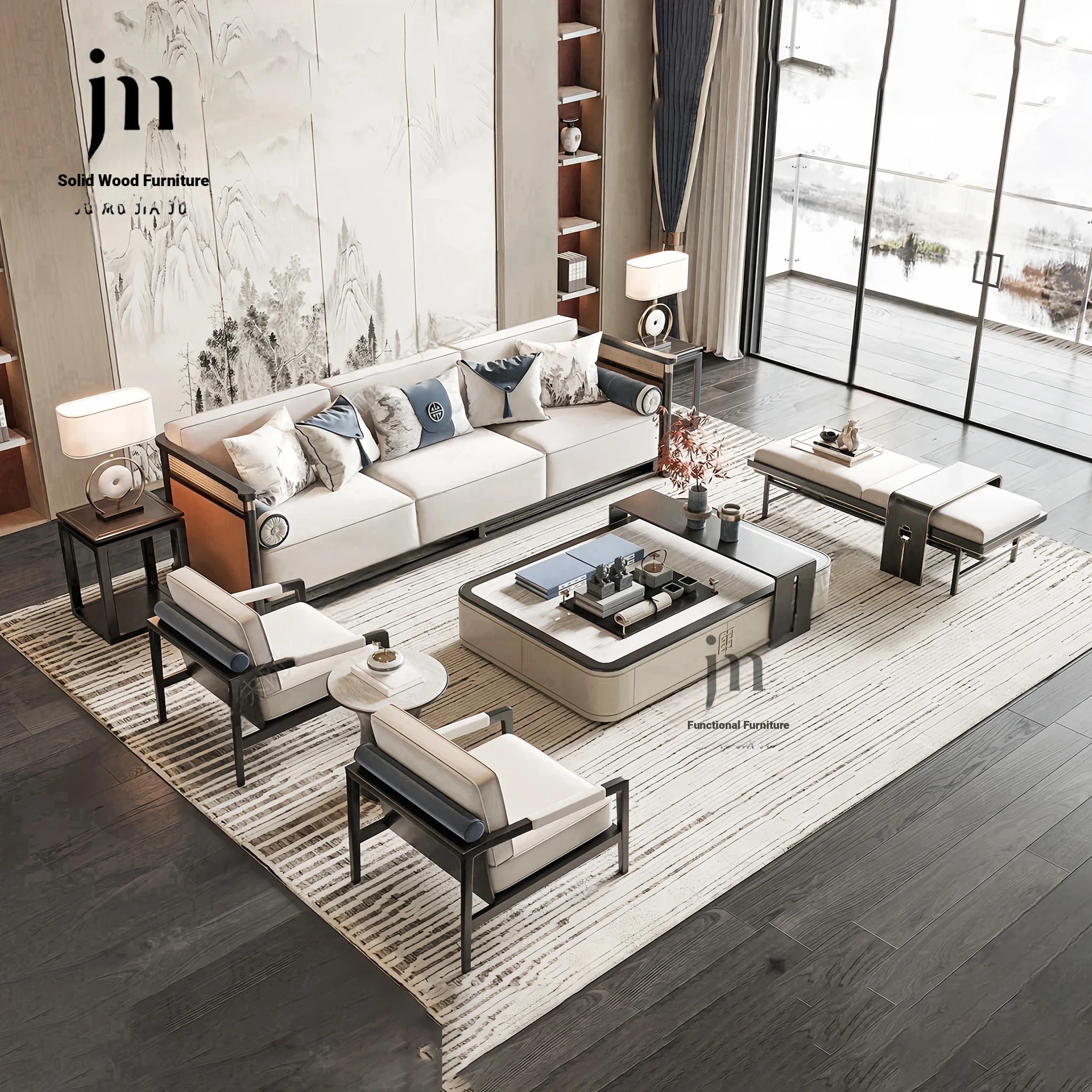 Modern Minimalist Solid Wood Sofa Set - Elegant New Chinese Style for Villas, Sample Rooms, Hotels & Clubs - Zen-inspired Living Room Furniture