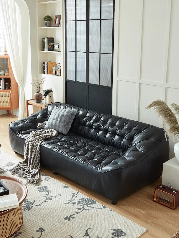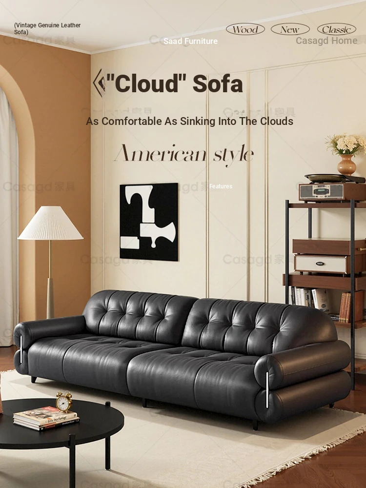 Casa French Genuine Leather Sofa - Black Sugar Cloud Series 2025 New Vintage Style Black Straight Sofa for Living Room - Embrace Comfort and Elegance