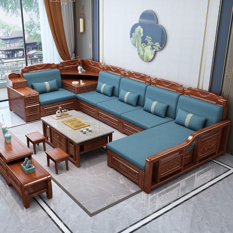 Luxury Solid Wood Sectional Sofa Set for Spacious Living Rooms - Versatile Winter & Summer Use, Elegant Chinese Style with Storage Chaise, Free Shipping!