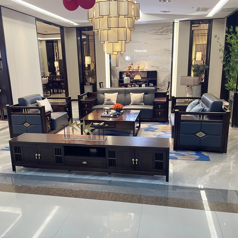 Designer New Chinese Style Solid Wood Sofa - Modern Minimalist Zen Leather Sofa Set for Villa Living Room - Embrace Chinese Aesthetics in Your Home