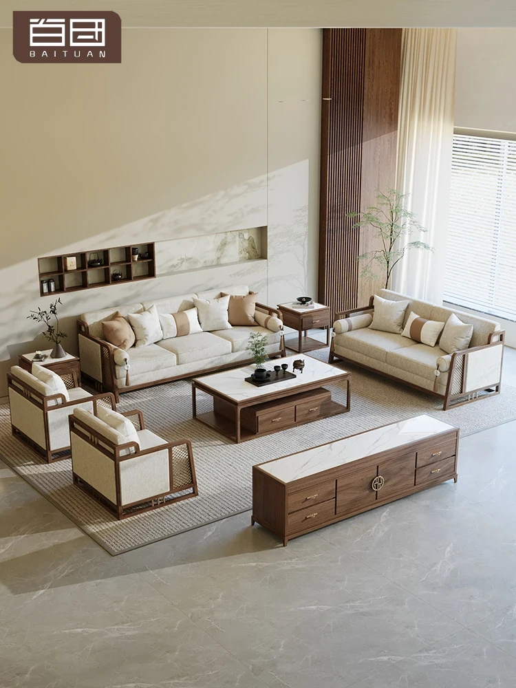 "Ruilin New Chinese Style Solid Wood Sofa - North American Black Walnut, Song Dynasty Aesthetics, Elegant Fabric Living Room Zen Furniture"