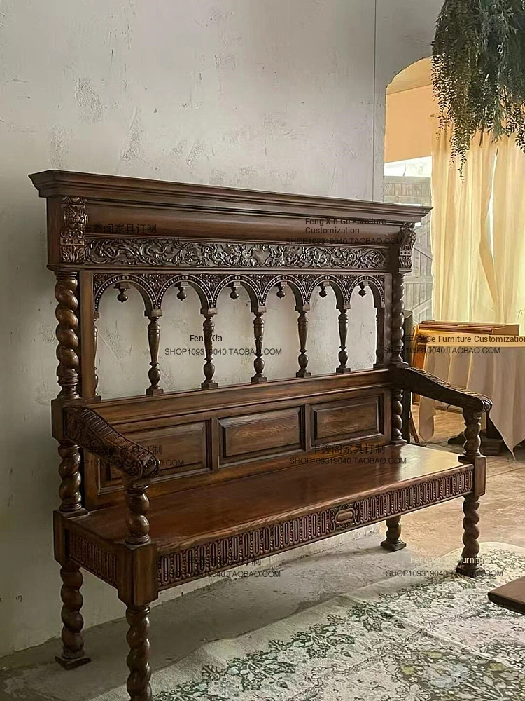 Vintage Solid Wood Carved Three-Seat Sofa - Antique European Style Church Chair from Old Shanghai, Perfect for Retro Photography and Elegant Interiors.