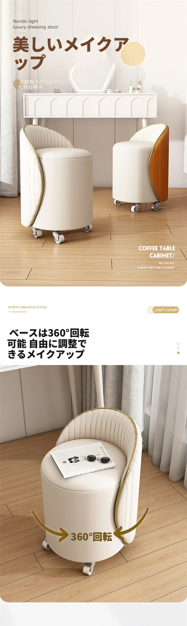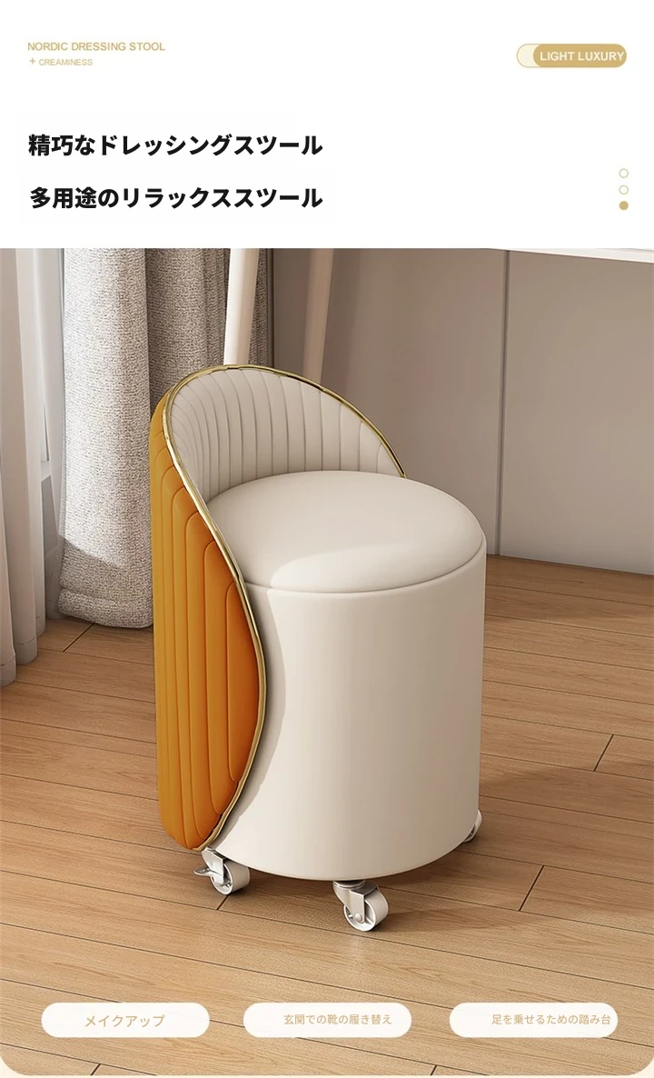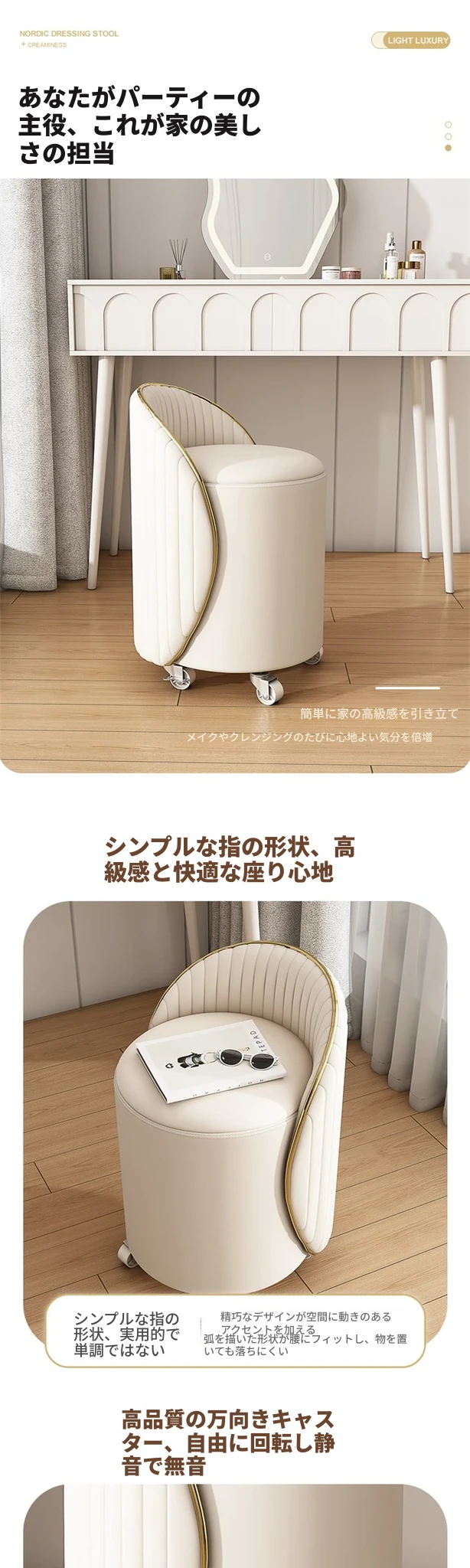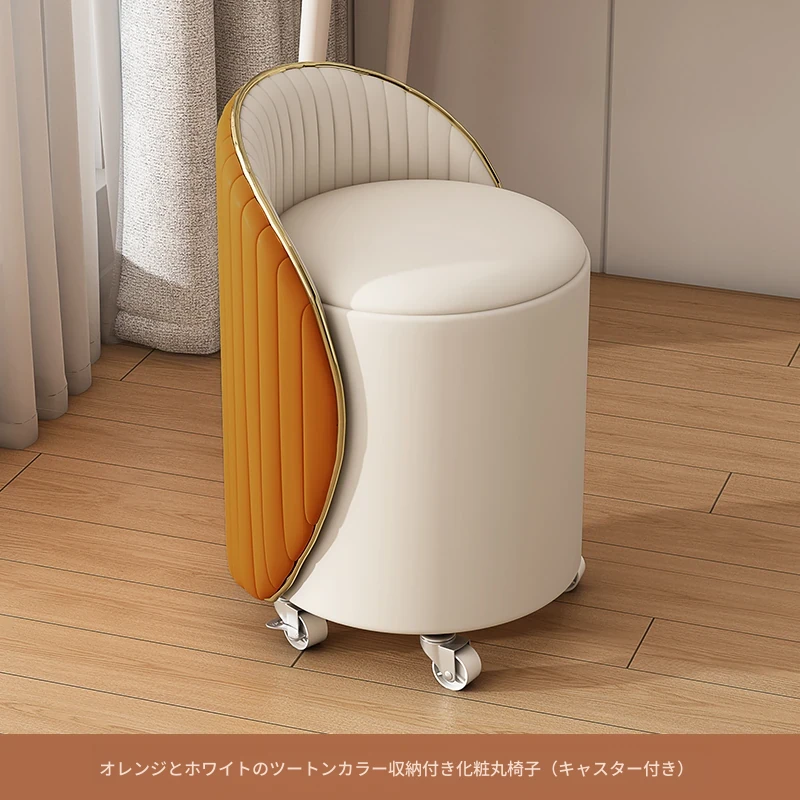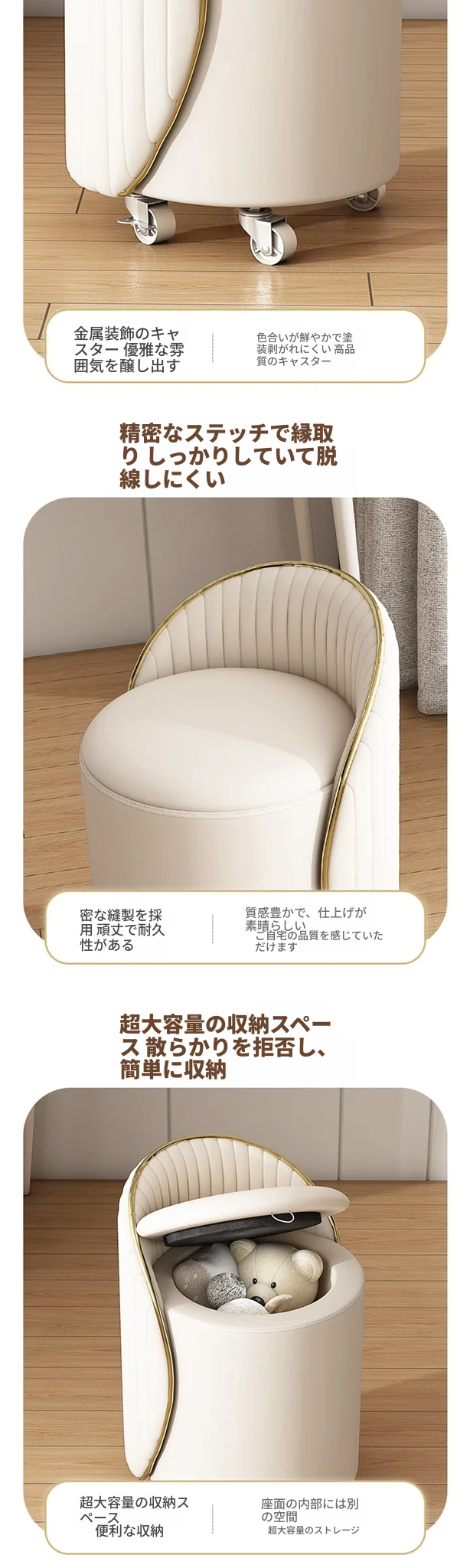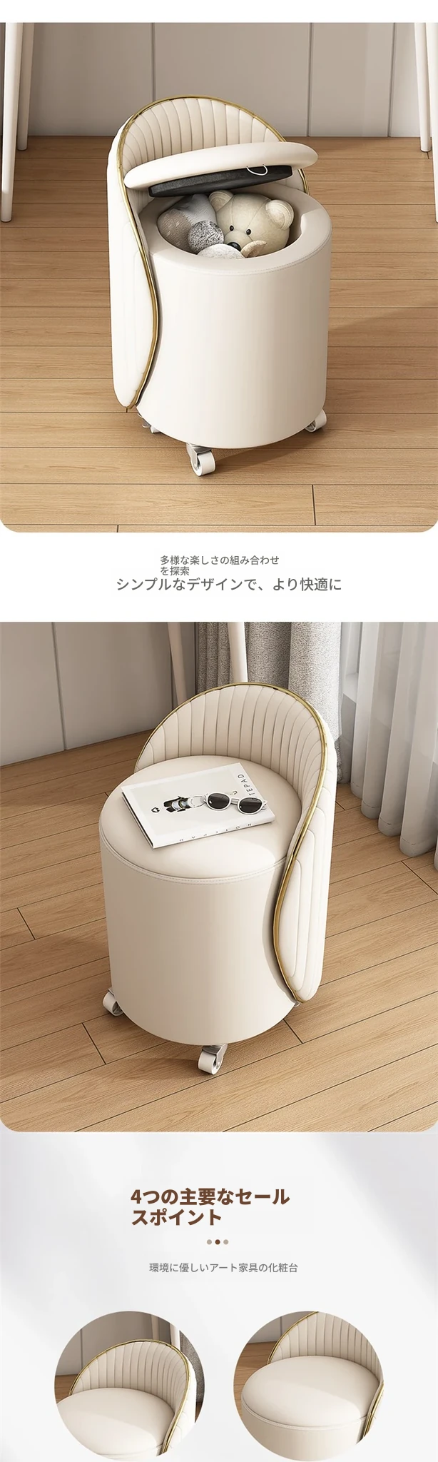 現代的なシンプルデザインのメイクアップチェア - 人気のインフルエンサーが愛用する、女の子のための可愛いナチュラル風メイク台用収納チェア!移動可能で、ネイルにも最適!あなたの寝室をおしゃれに彩ります。