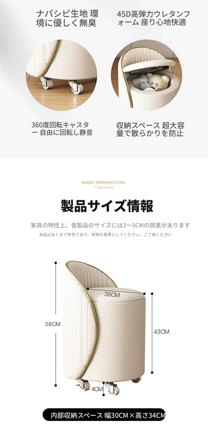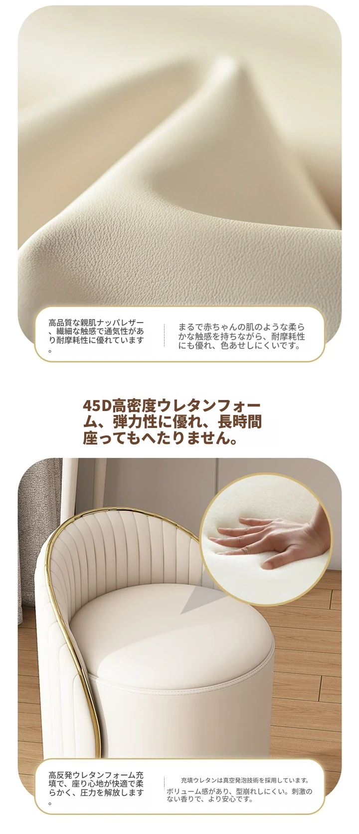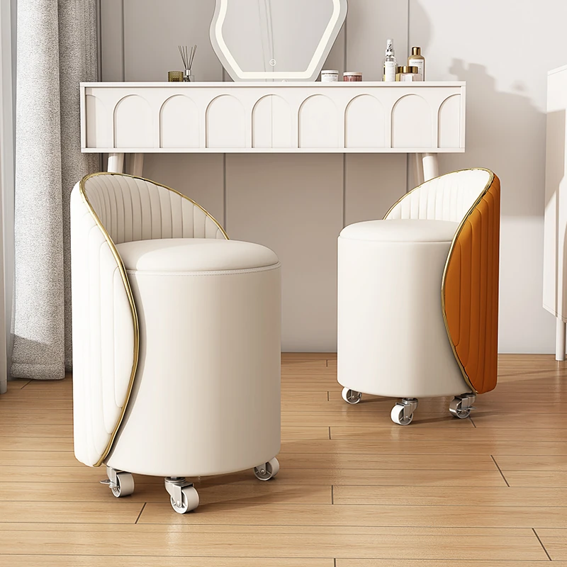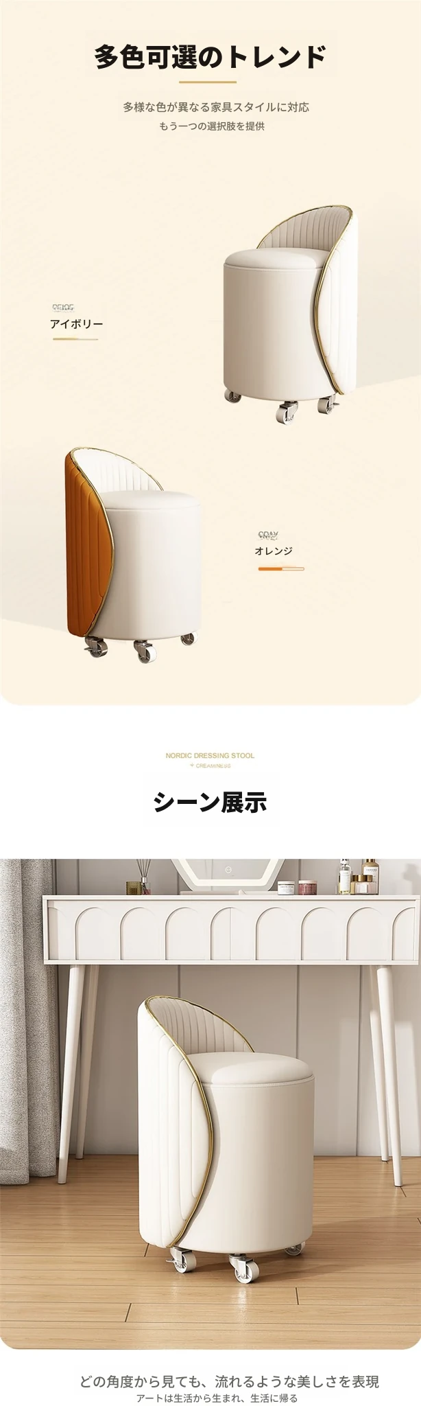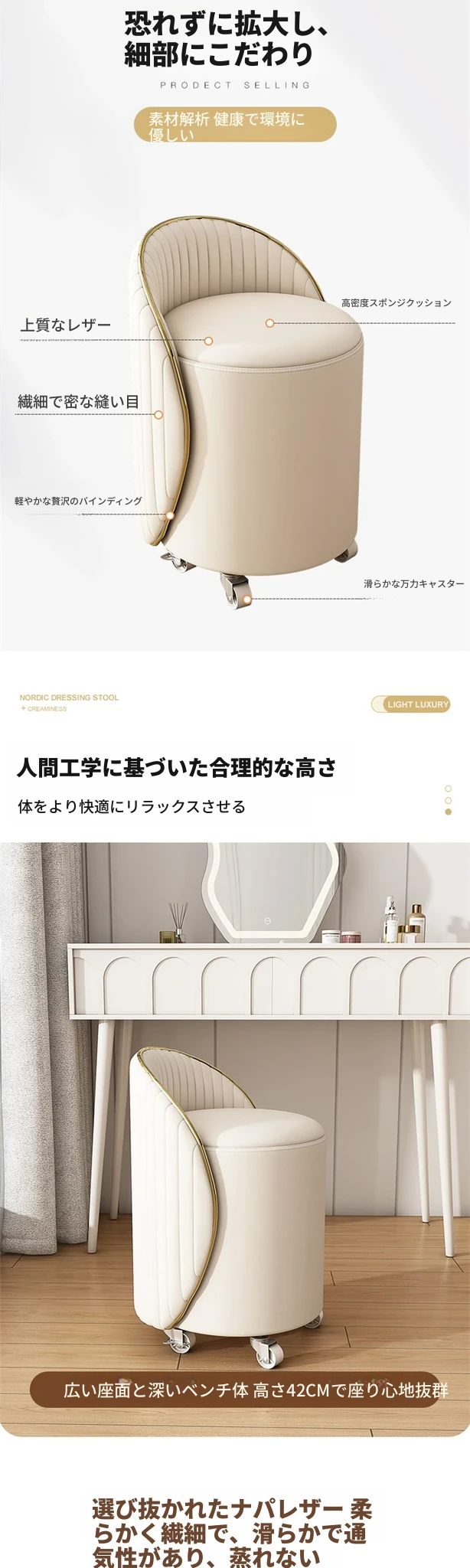 現代的なシンプルデザインのメイクアップチェア - 人気のインフルエンサーが愛用する、女の子のための可愛いナチュラル風メイク台用収納チェア!移動可能で、ネイルにも最適!あなたの寝室をおしゃれに彩ります。