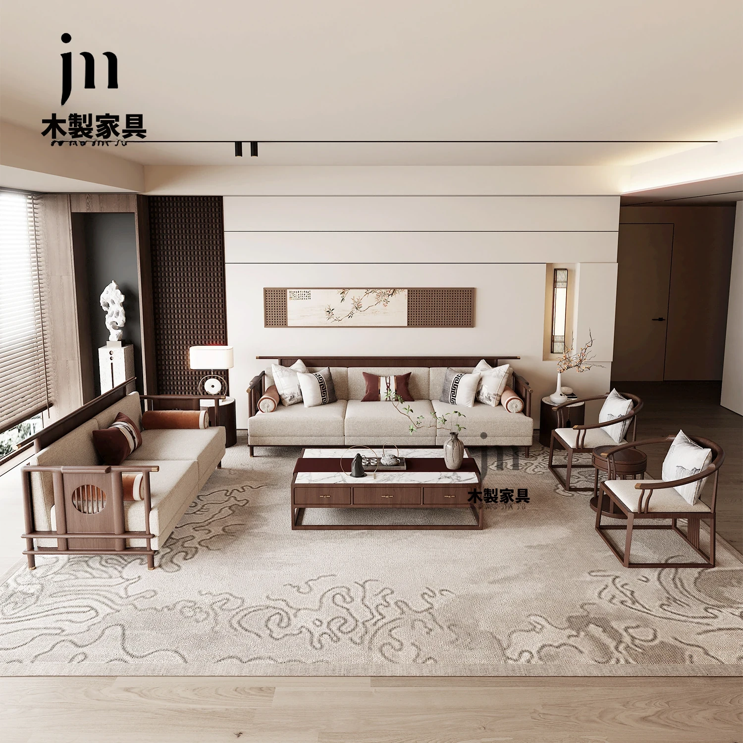 新中式スタイルの無垢材ソファセット|現代のレトロ感漂うカウチ|モデルルームにぴったりなリラックスチェア|布製ソファで心地よい客間家具を演出!