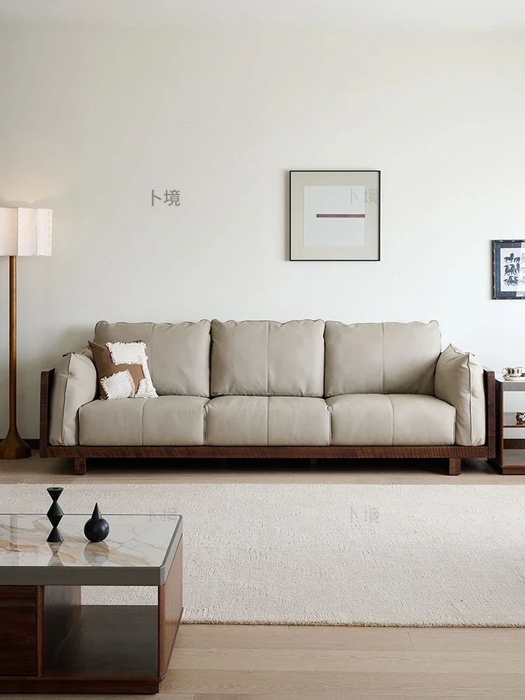 2025年新作!モダンミニマリストデザインのブラックウォールナット無垢材ソファー。高級な本革トップグレイン牛革を使用した4人掛け直排スタイル。リビングルームに最適な洗練されたスタイルと快適さを体験してください!