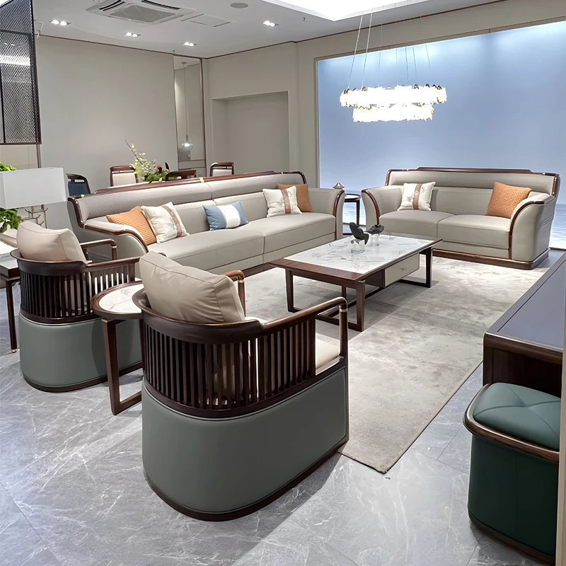 現代的中華風格 ウッディブラックレザーオフィスソファ 1+2+3コンビネーション - 高品質な牛革と無垢材の組み合わせで、洗練されたデザインと快適性を提供します。あなたのオフィス空間を格上げ!