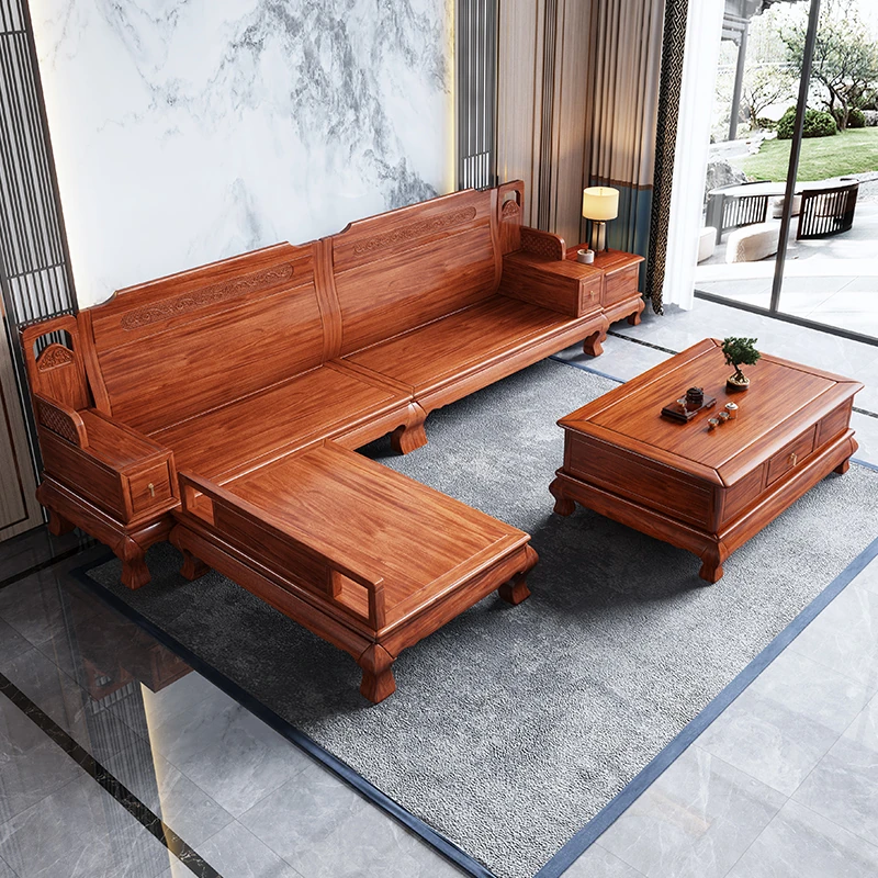 高級花梨木製の実木ソファ、貴妃スタイルのL字型コンビネーション。冬夏兼用、収納機能付きの彫刻デザイン。小型住宅にぴったりの中華スタイルリビング家具!