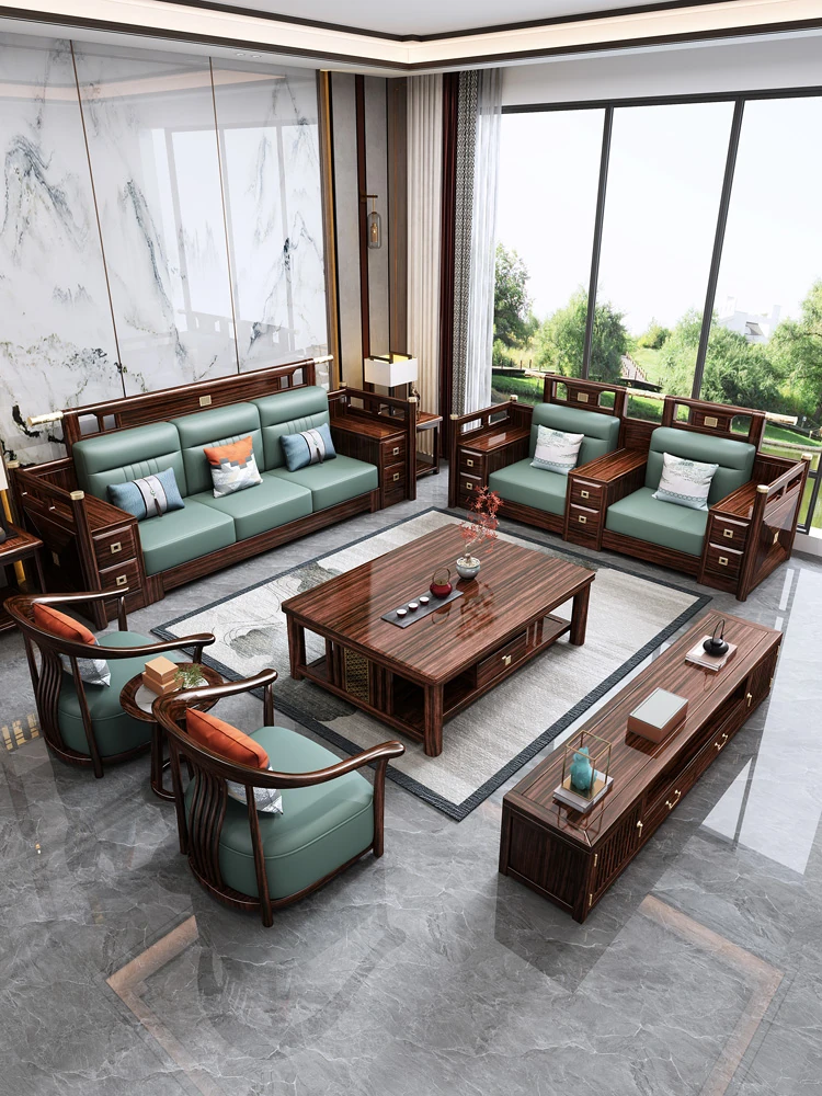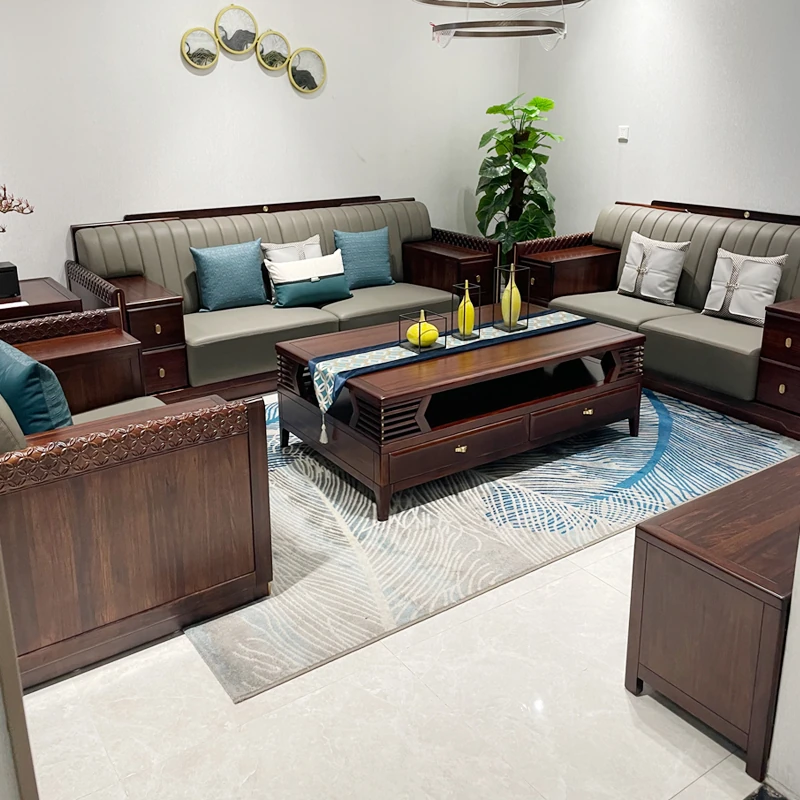 新中式ウッドブラックソファセット - 高級感あふれる全木製、現代的なデザインのリビングルーム用。広々とした別荘や大きな家にぴったり、軽やかな贅沢を実現する家具です。