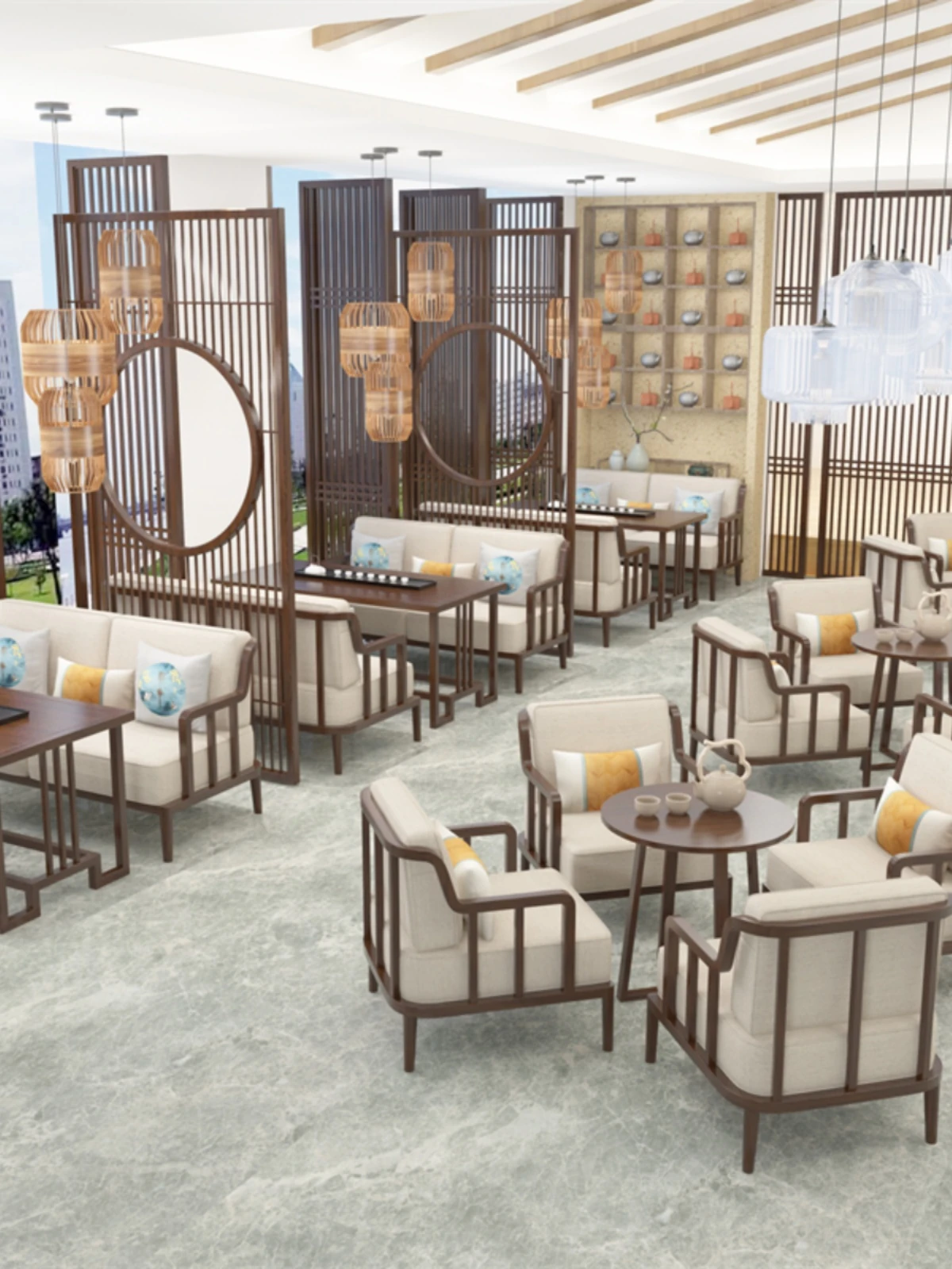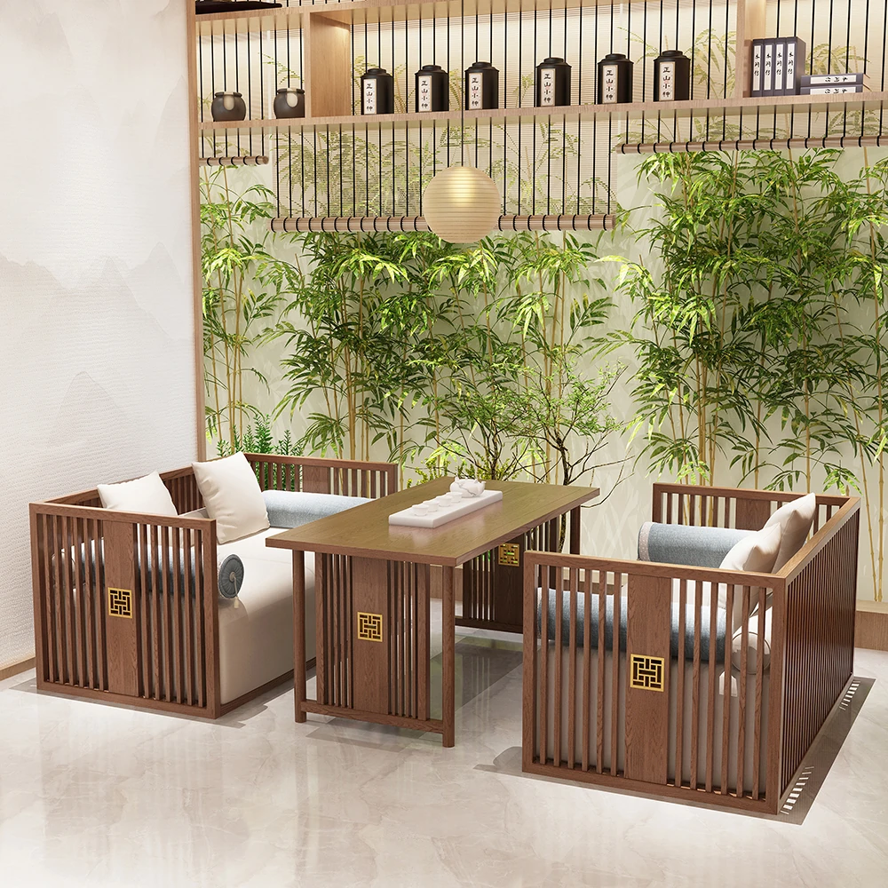 新中式茶楼カウンター席の高級感あふれる無垢材ソファセット - レストラン・ホテル・販売所の接客や商談に最適な家具、民宿にもぴったり!