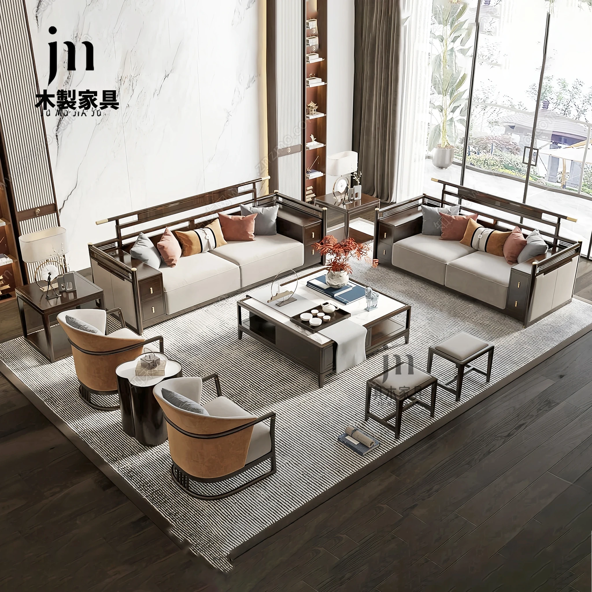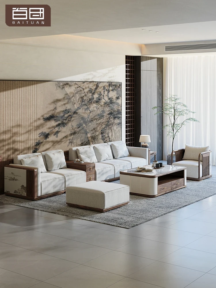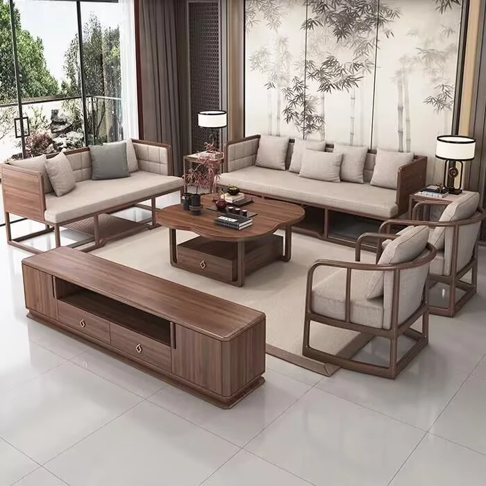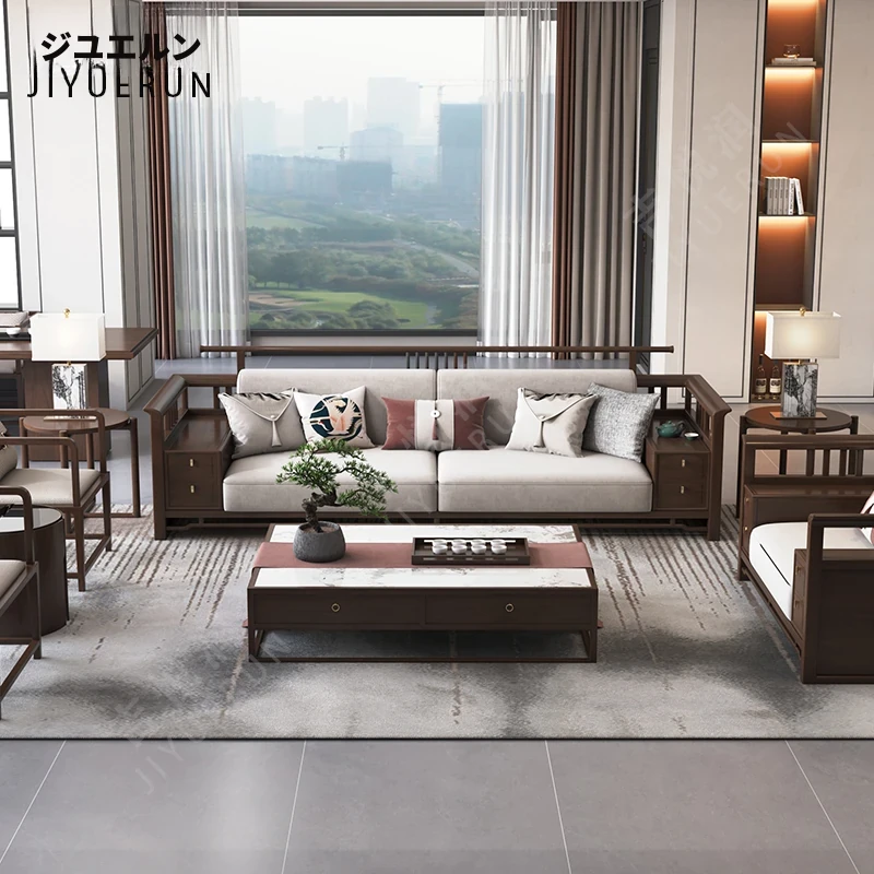 新中式ウーキン材全実木ソファセット|現代的でシンプルな高級別荘向け|広々としたリビングに最適な禅スタイル家具