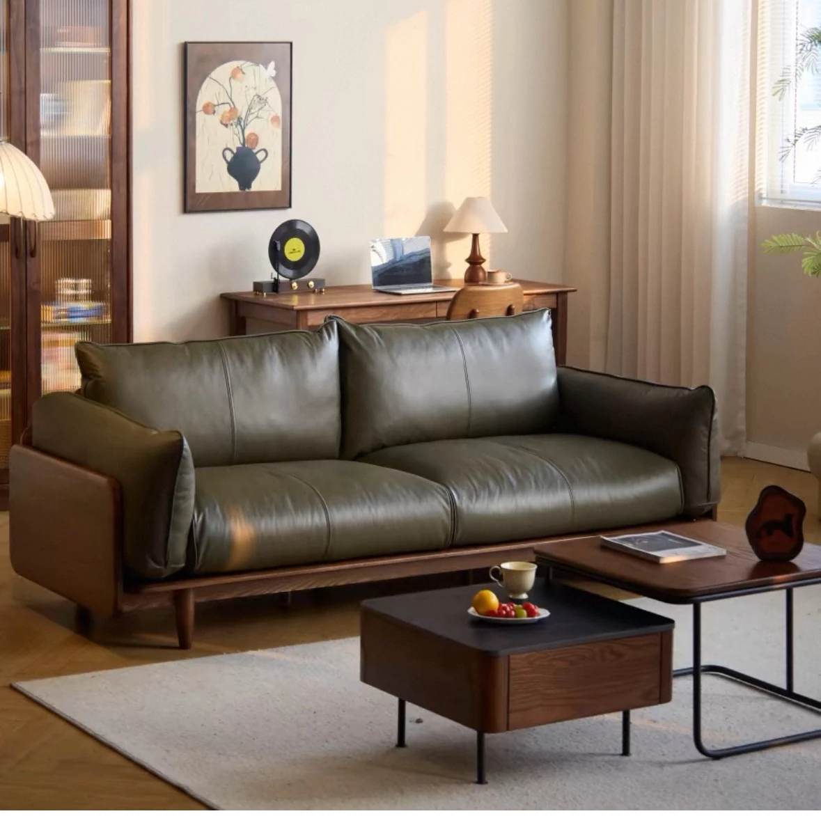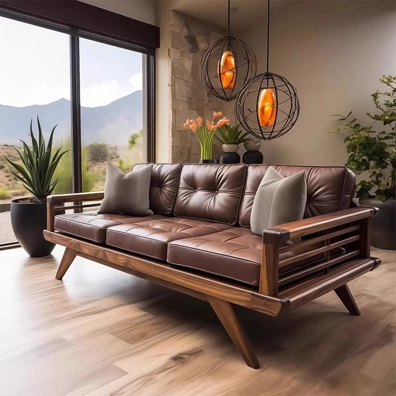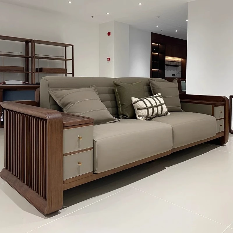 北米産ブラックウォールナットのリビングソファ - シンプルで高級感あふれる本革仕上げ、ナチュラルな木材を使用した新中式デザイン。広々とした大空間にぴったりの直線的なスタイル。