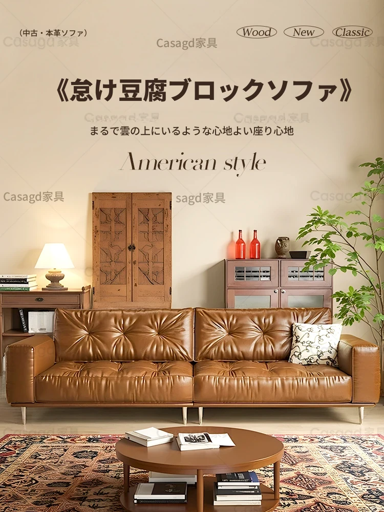 2025年新作!casaフランス風ヴィンテージ本革ソファー - コンパクトなリビングにぴったりな豆腐ブロックデザイン、レトロな魅力を引き立てるスタイリッシュなインテリアアイテム!