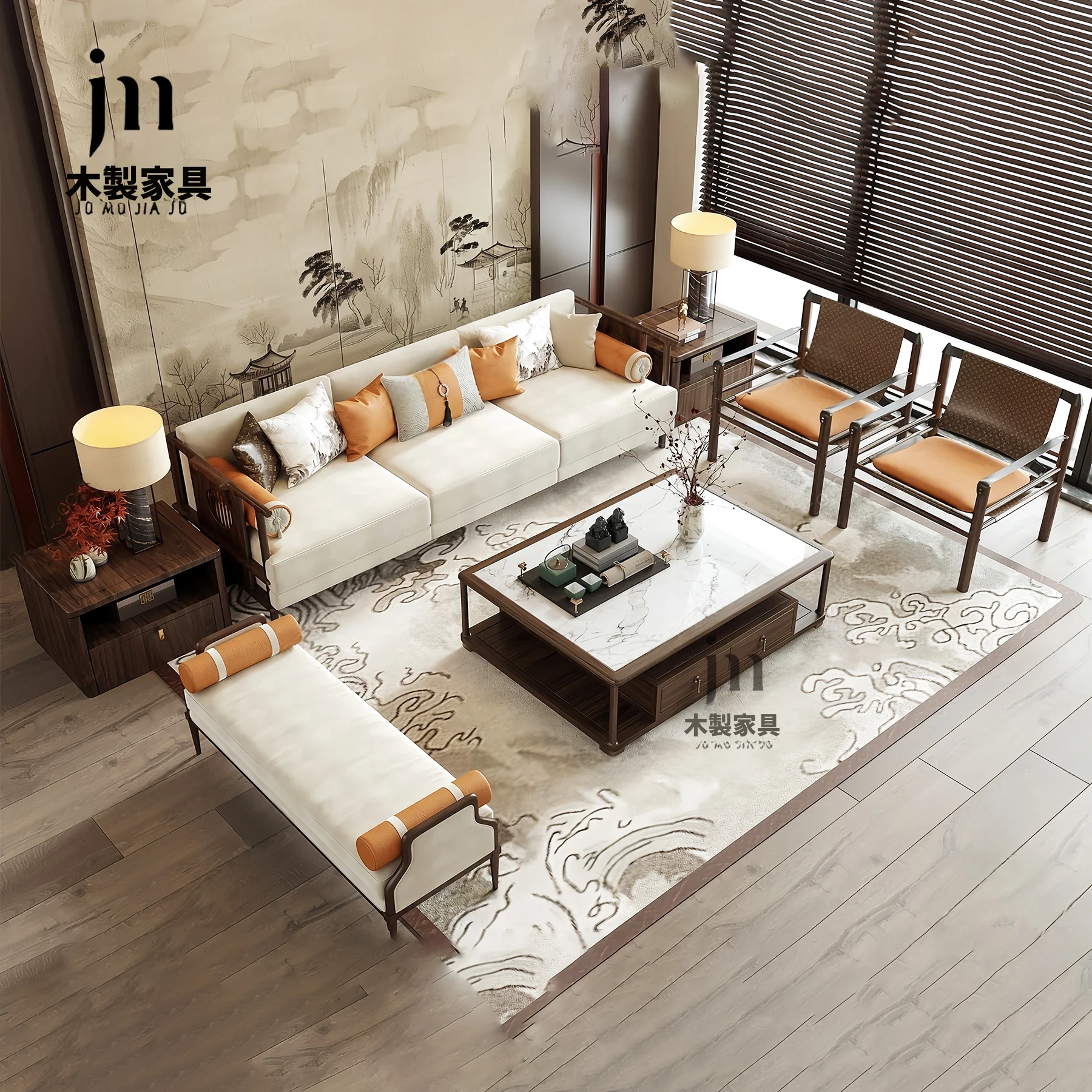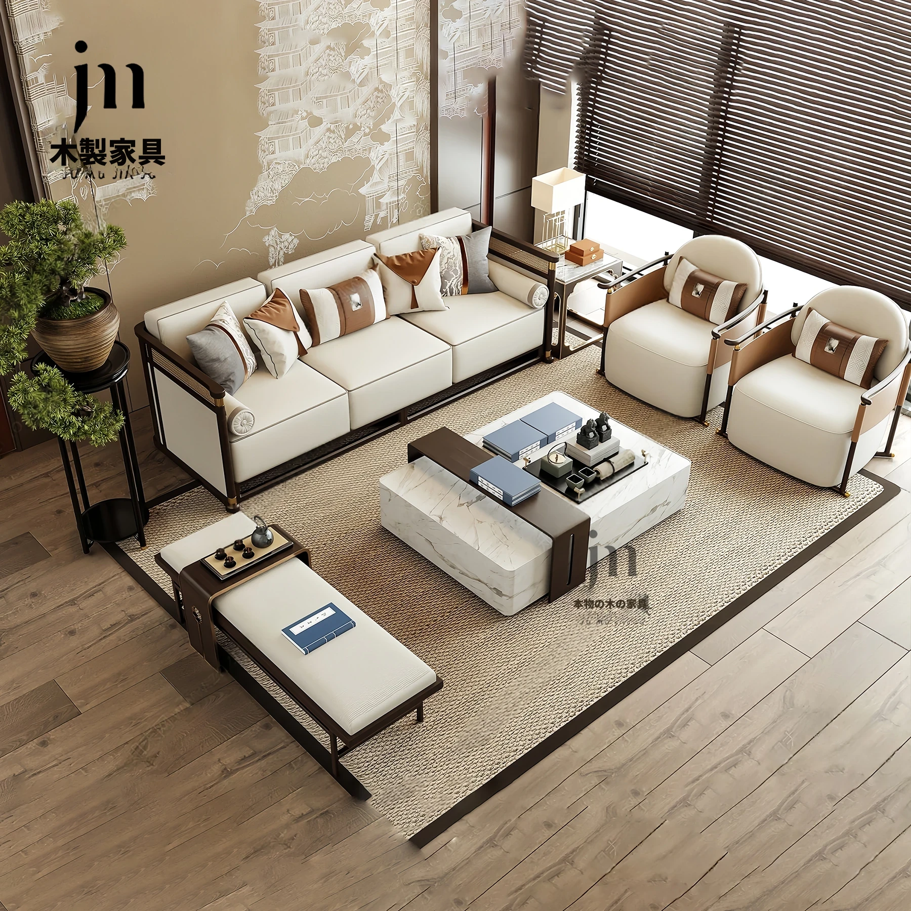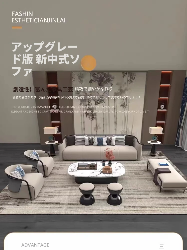 新中式ウーキン木材使用の高級モダンソファ、広々としたヴィラリビングにぴったり。中国風の禅の雰囲気を感じる、洗練されたデザインの家具。大空間に最適な一品です。