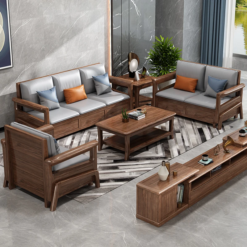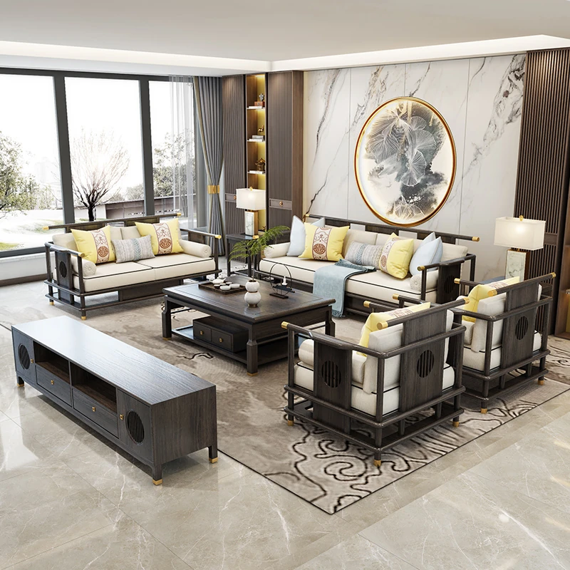 新中式スタイルの無垢材ソファセット - モダンでラグジュアリーな簡約デザイン、リビングルームやモデルルーム、クラブ、ホテルに最適なサイズの家具!あなたの空間を洗練された雰囲気に変えます。