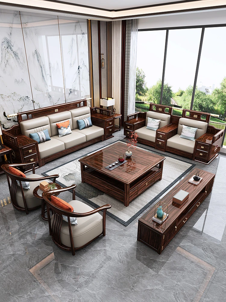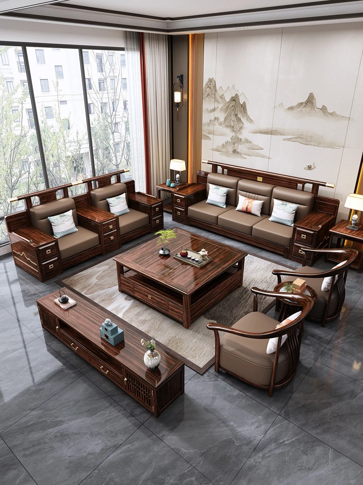 ウルキン材の新中式スタイル高級実木ソファセット - ヴィラ向け、禅の雰囲気漂う軽奢な全収納家具。洗練されたデザインで、居心地の良いリビングを演出します。
