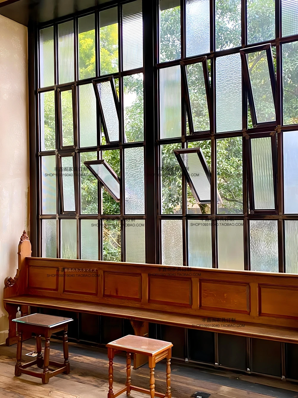 フレンチヴィンテージ無垢材彫刻長椅子 - 多人数用ソファ、アンティーク風、宿泊施設やホテルの受付、教会の椅子にも最適。おしゃれで温かみのある空間を演出します!