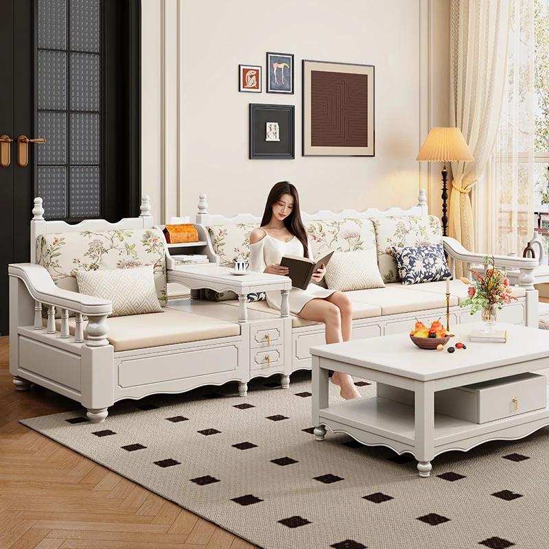 2025年新作!アメリカンスタイルのホワイトウッドソファセット、クリーミーな風合いで小さなリビングにぴったり。収納付きコーナーソファで、スッキリとした空間を実現!