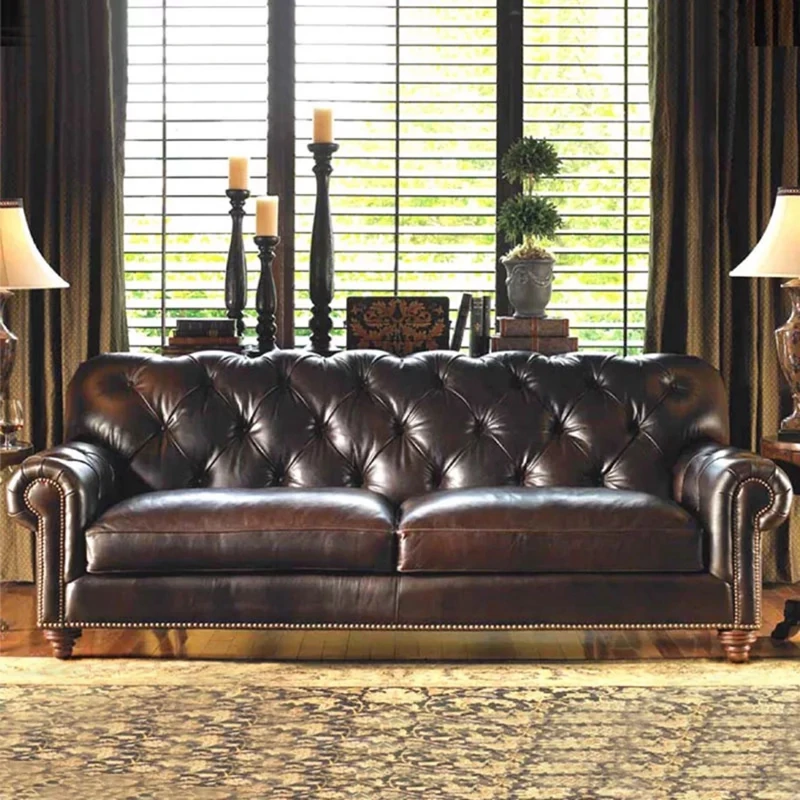 アメリカンレトロデザインの高級本革ソファ - ヴィンテージ仕上げ、三人掛け、ホテルやモデルルームに最適な欧風スタイル。最高級の牛革を使用し、快適さとスタイルを両立!