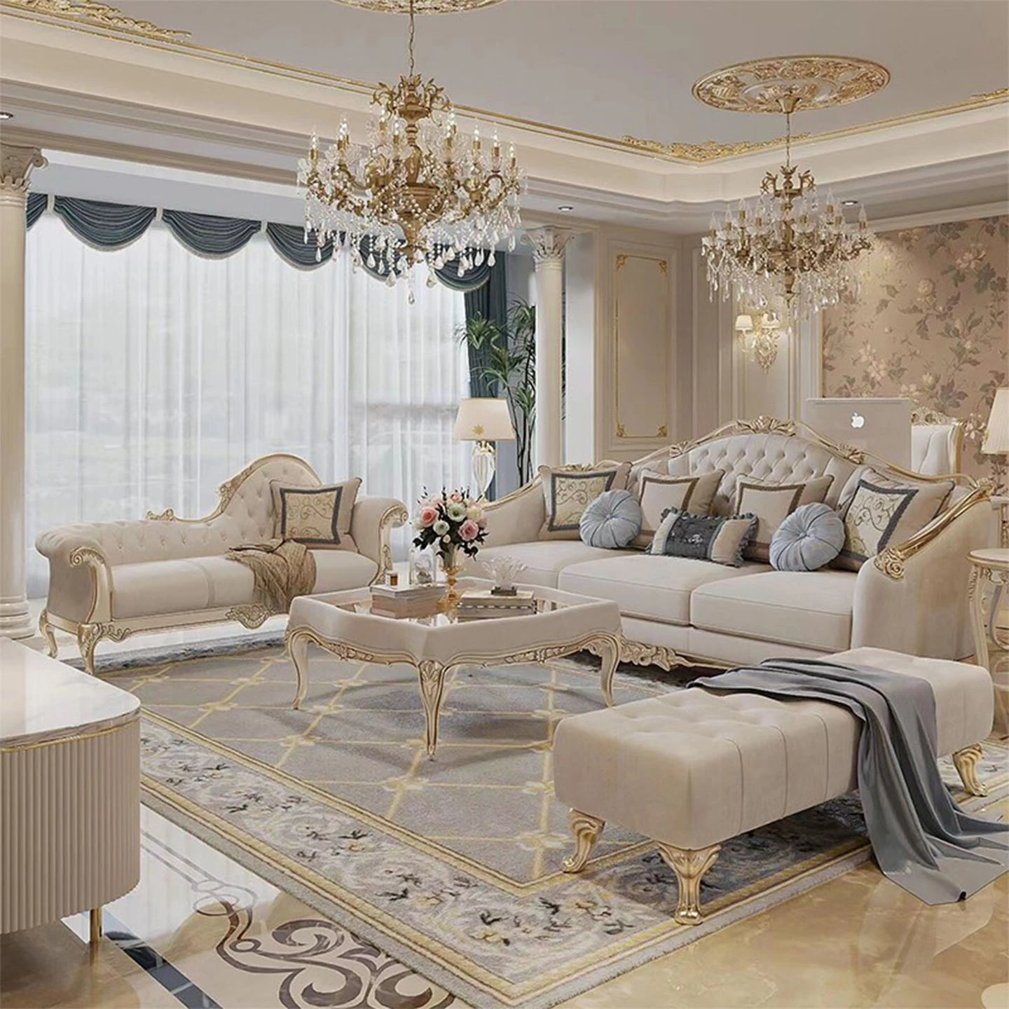 アメリカンスタイルのラグジュアリーな布製ソファ フレンチ・ニュークラシックデザイン 高級別荘向けのブナ材彫刻入り シャンパンカラーの3人掛けソファで、優雅なリビング空間を演出!