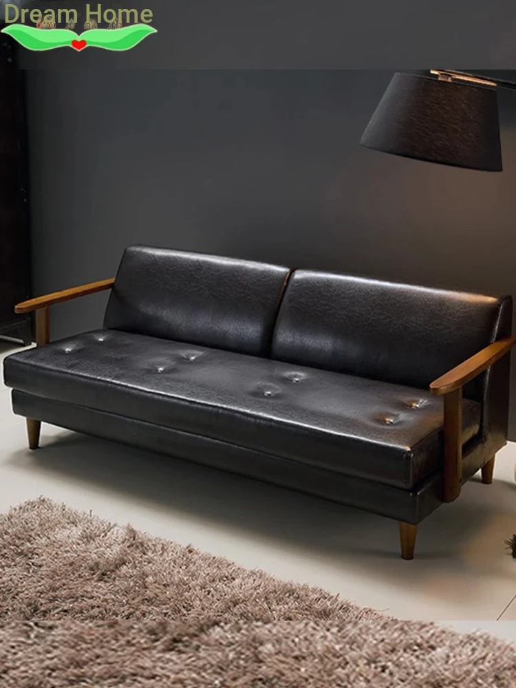 Nordic Vintage Minimalist Leather Sofa for Small Spaces - Perfect for Japanese-Style Living Rooms, Offices, or Clothing Stores – Comfortable Three-Seater with Solid Wood Frame