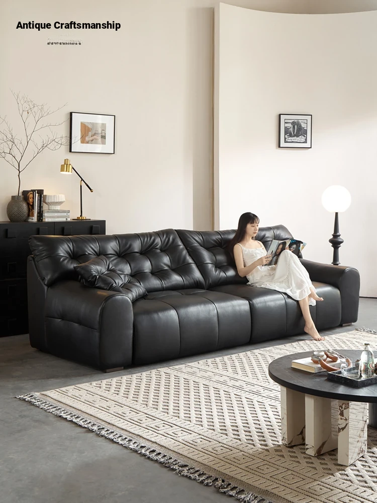 Nordic Retro Genuine Leather Sofa - Black Italian Luxury for Small Living Rooms, Featuring Top Grain Cowhide and a Chic Straight-Line Design for a Stylish Three-Seater Experience.