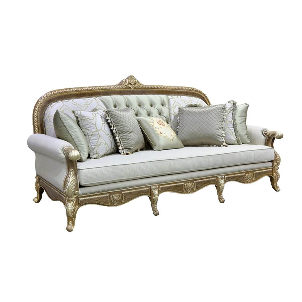 European Neoclassical Solid Wood Carved Sofa with Button Design - French Chic Light Luxury in Champagne Gold, Minimalist Vintage Living Room Furniture Set