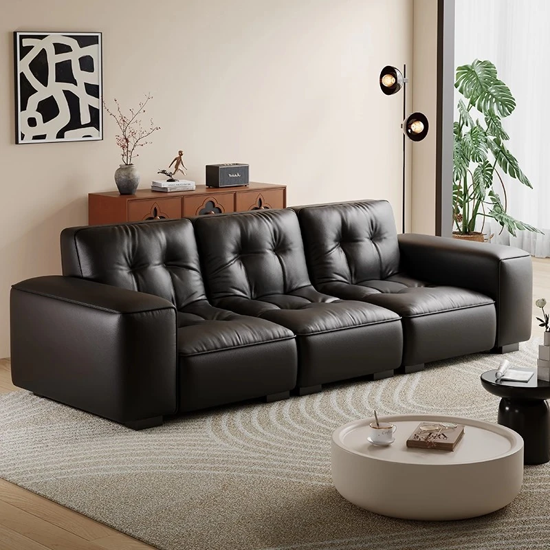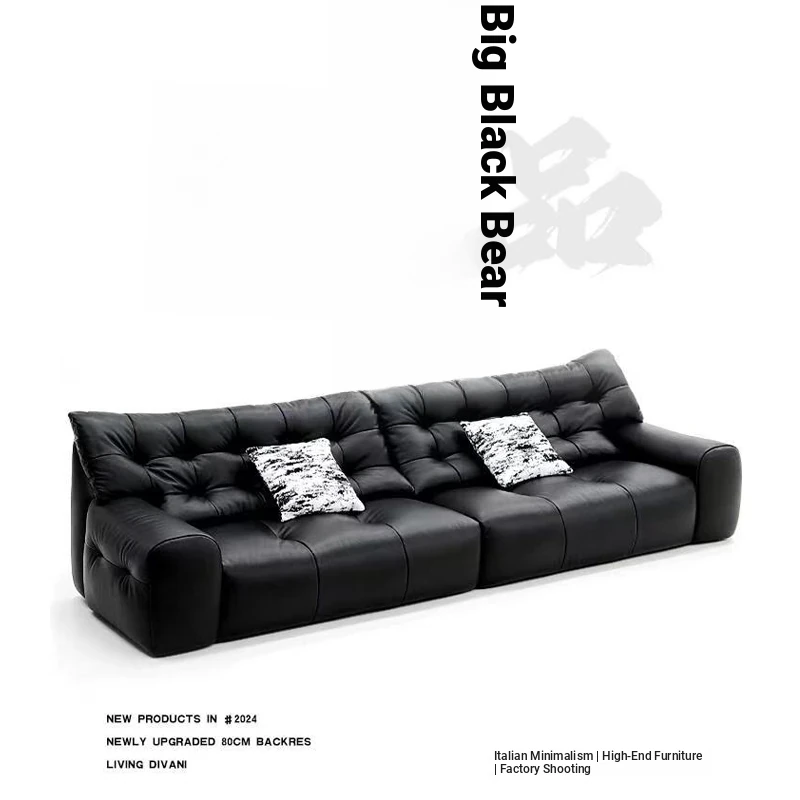 Italian Minimalist Large Black Bear Genuine Leather Sofa - Premium Top-Grain Cowhide for Small Living Rooms - Modern Simple Black Leather Upholstery