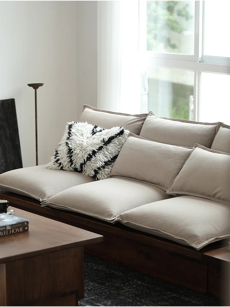Nordic Black Walnut Solid Wood Sofa Set - Single, Double, and Three-Seat Options, Japanese Wabi-Sabi Style, All Solid Wood and Fabric Design, Perfect for Cozy Guesthouses and Modern Living Spaces.