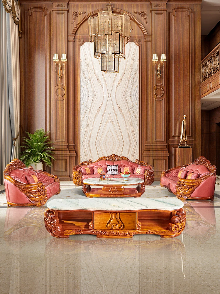 Luxury European-Style Solid Wood Sofa Set with Genuine Leather and Intricate Carvings - Perfect for Spacious Villas and Grand Living Rooms, Bringing Prosperity and Elegance to Your Home.