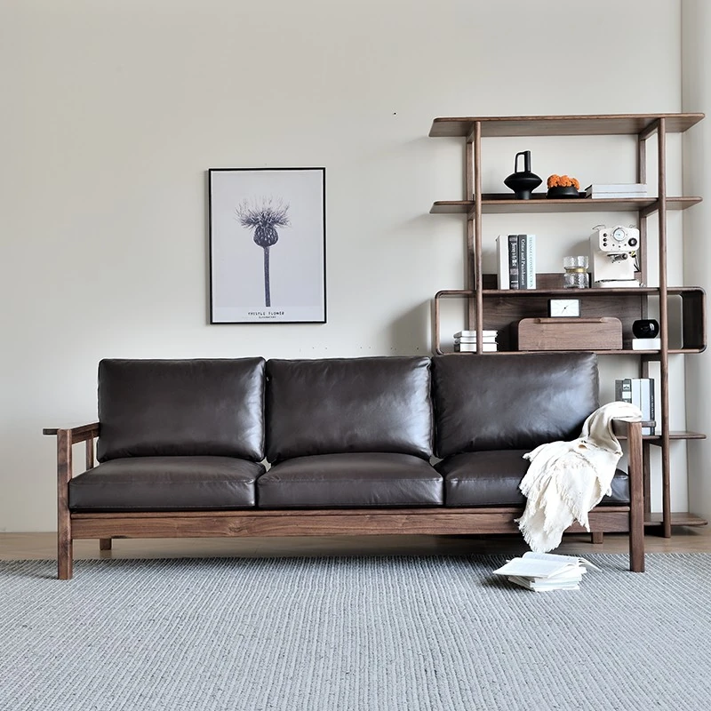 North American Black Walnut Solid Wood Sofa Set - Genuine Leather, Top Grain Cowhide, Nordic Japanese Minimalist Style for 3-4 People