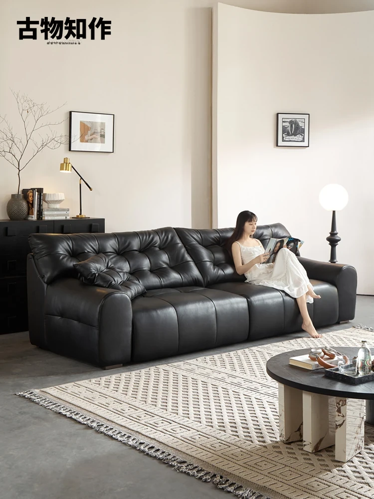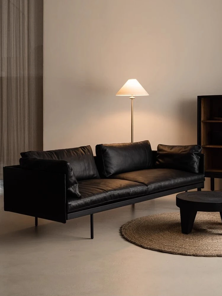 北欧風レトロ本革ソファ|ブラックイタリアンデザイン|ラグジュアリーな小型リビング向け|高品質トップグレインレザー使用|スリムな3人掛けソファで快適空間を演出!