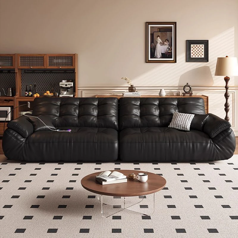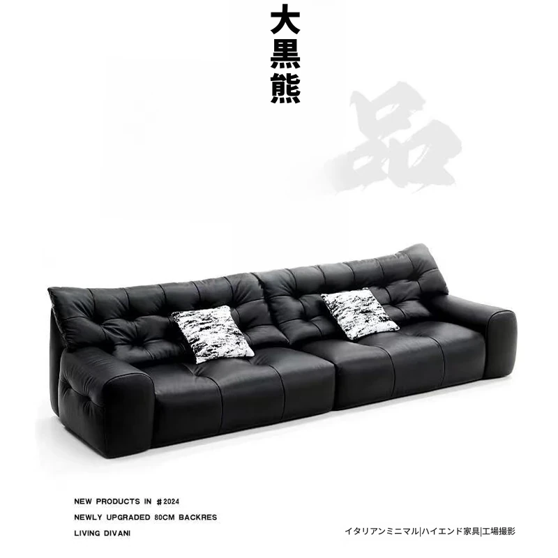 イタリアンミニマルデザインの本革ブラックベアソファ - 高級トップグレイン牛革使用、小型リビングに最適なモダンシンプルな黒いレザーソファ。洗練されたスタイルで、快適なくつろぎ空間を演出します!