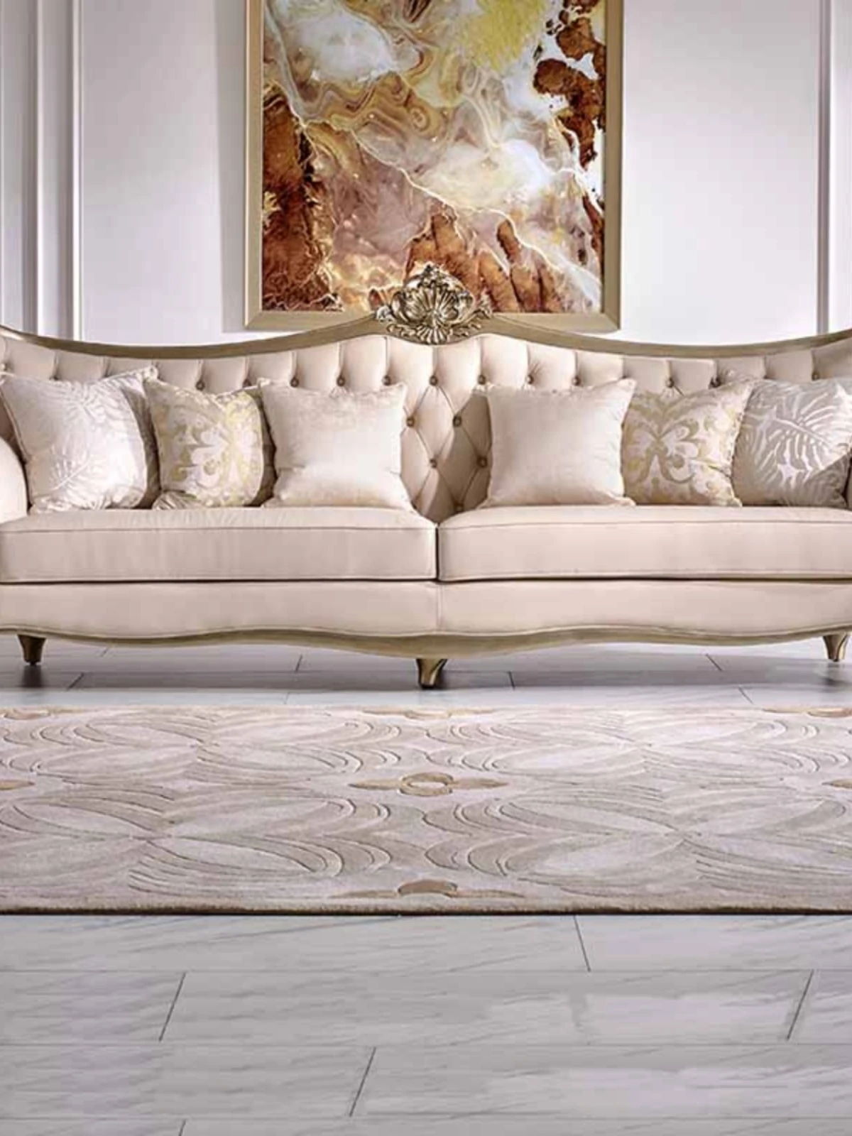 欧風新古典スタイルの無垢材彫刻ソファ、フレンチラグジュアリーのシャンパンゴールド仕上げ。シンプルでありながら洗練されたデザインのリビングルーム家具セット。あなたの空間に優雅さと温かみをプラス!