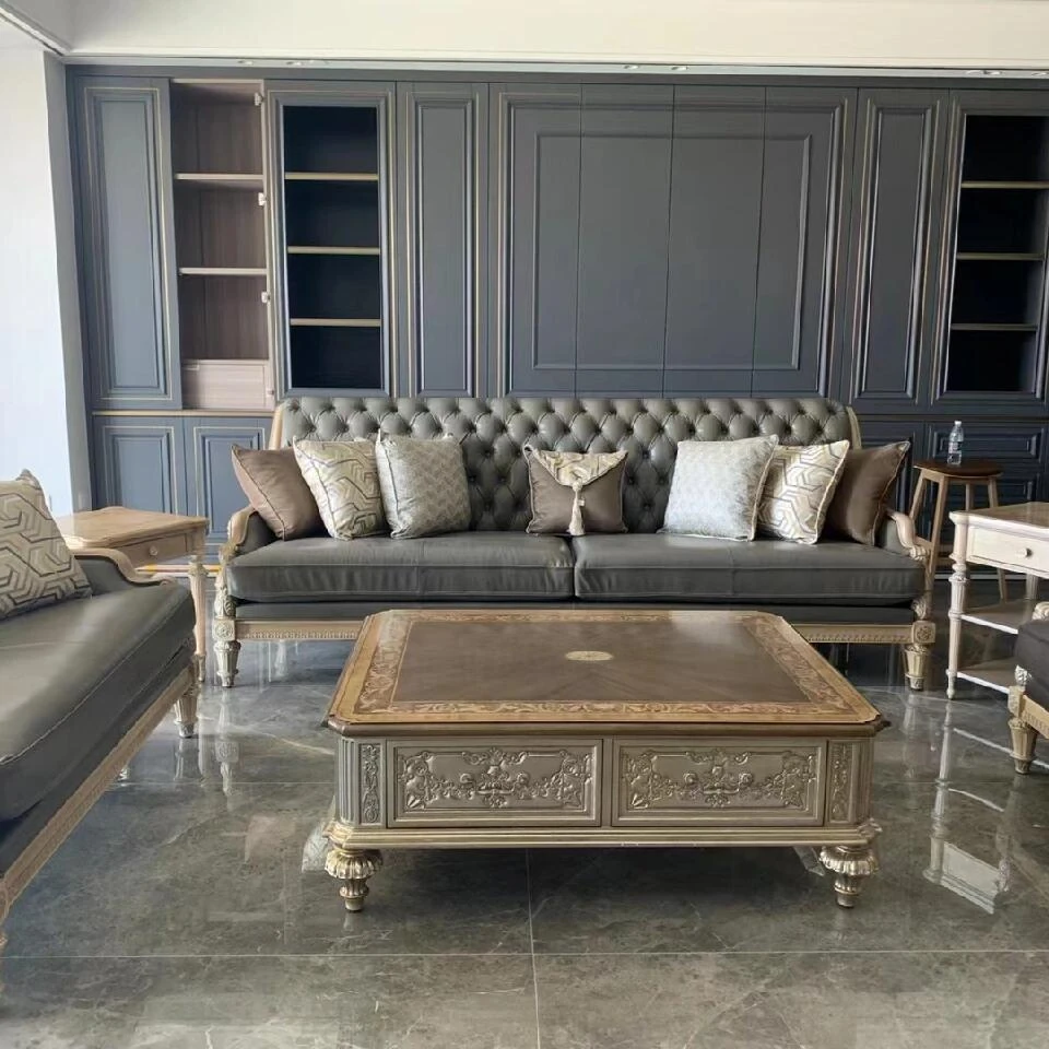 アメリカンラグジュアリー本革ソファセット|別荘リビングにぴったりの欧風豪華デザイン|高品質な無垢材使用のフレンチスタイル家具で、洗練された空間を演出します!