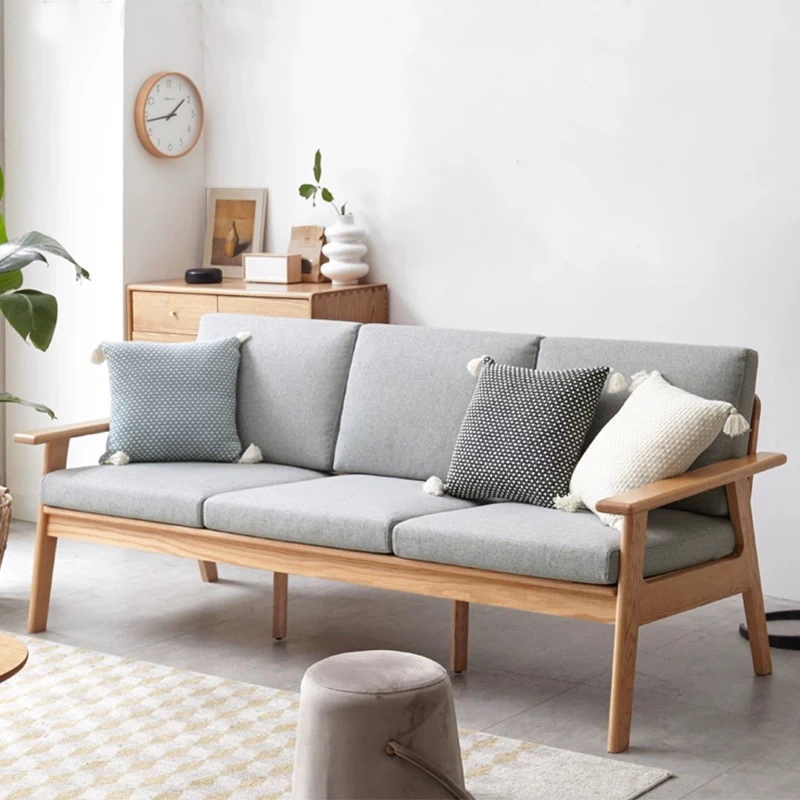 工場直販!北欧スタイルの全実木オーク製、夏冬兼用の3人掛けソファ。柔らかいクッション付きで、リビングにぴったりの快適なソファセットが大人気!