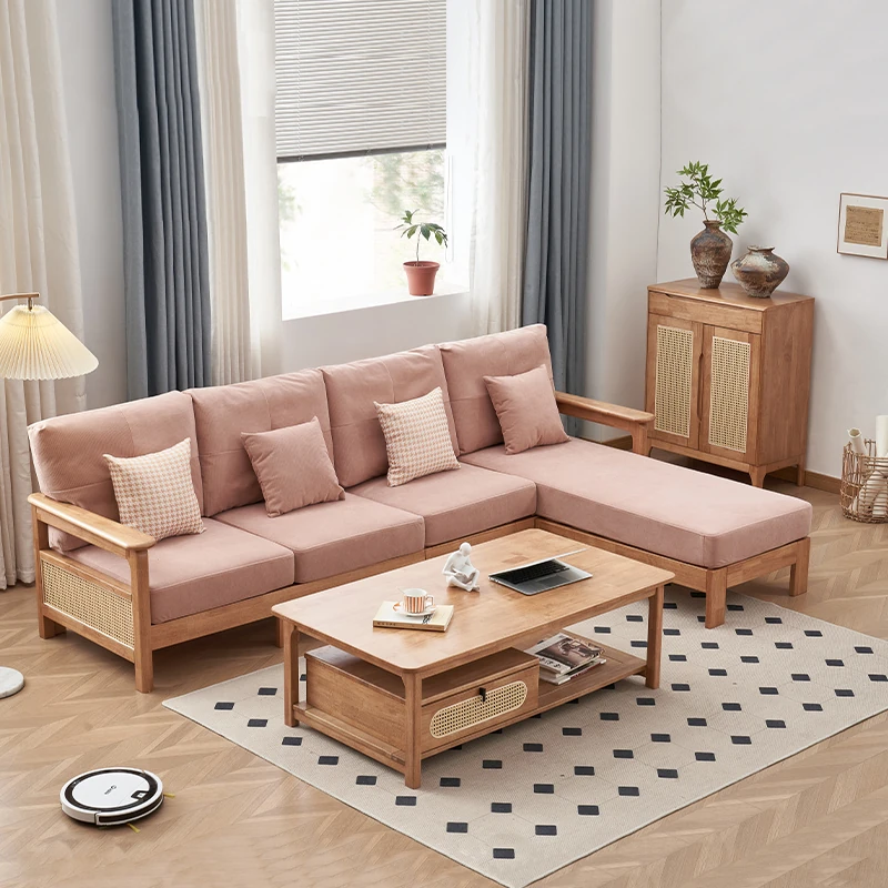 侘寂スタイルの無垢材ソファセット - シンプルで洗練された原木色、小型住宅に最適なコーナー付きデイベッドソファ!おしゃれで快適なリビング空間を演出します。