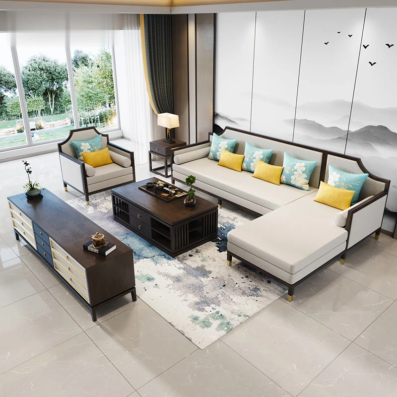 新中式の天然木製ファブリックコーナーソファセット - モダンでシンプル、小さな部屋にもぴったりな中国風リビングルーム家具!スタイリッシュなデザインで、居心地の良い空間を演出します。