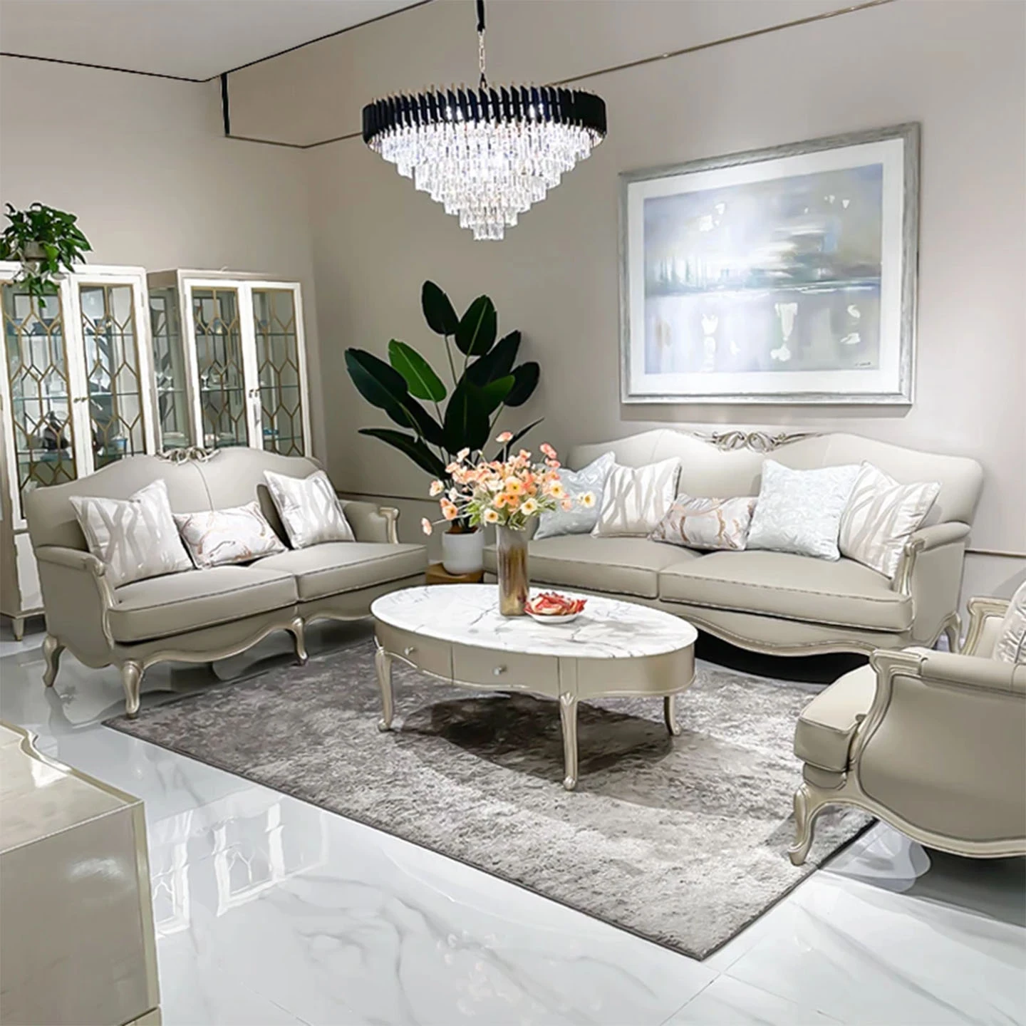 フランス風のラグジュアリーな無垢材ソファ!小型住宅に最適なアメリカンスタイルの豪華な彫刻入り3人掛けソファセット。洗練されたデザインで、あなたのリビングを一層魅力的に演出します。