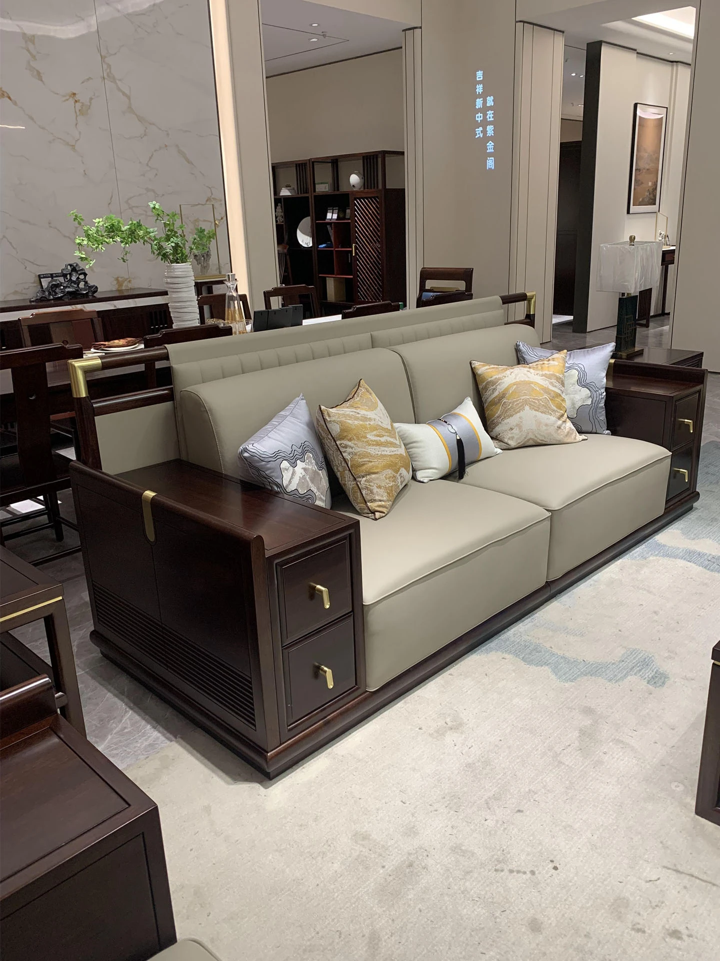 新中式ブラック檀木真皮ソファセット - モダンでシンプルな高級感溢れる別荘リビングに最適な家具!上質な素材と洗練されたデザインで、心地よい空間を演出します。