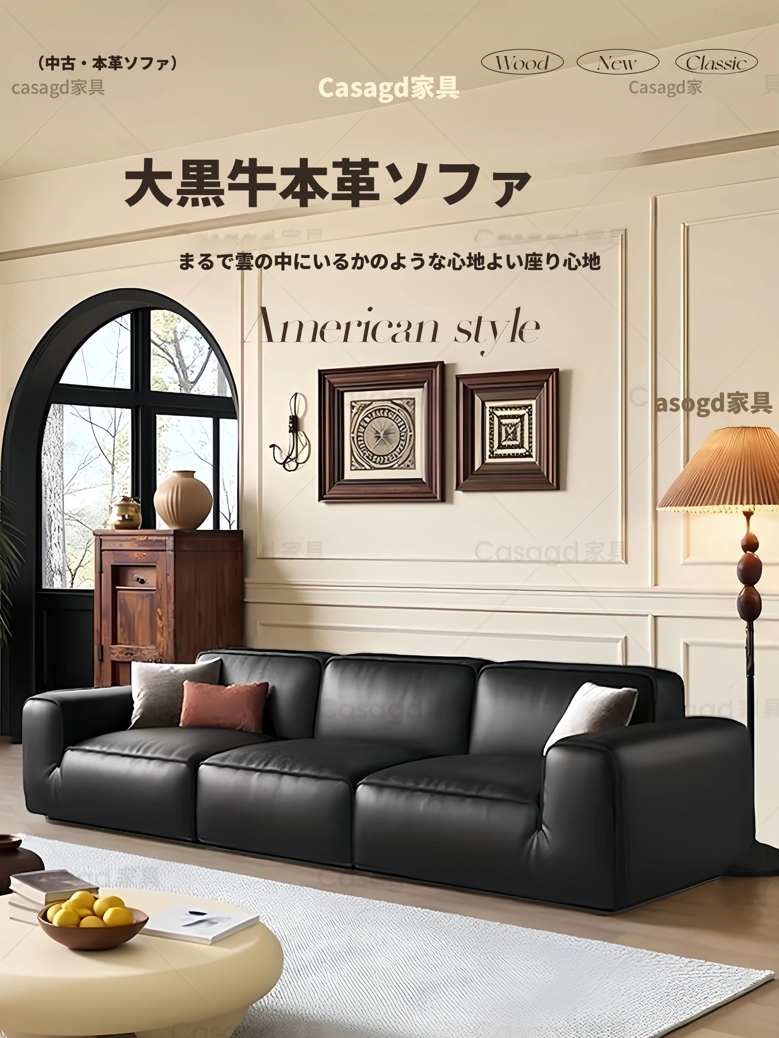 CASAGD中古風スタイル大黒牛革リビングルーム用本革ソファ - シックなブラック豆腐ブロックデザイン、2025年新作登場!高品質な頭層革で、贅沢な座り心地を実現。あなたのリビングに洗練された雰囲気をプラスします。