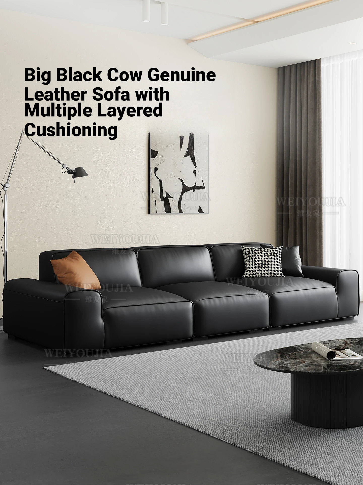 Premium Black Leather Sofa - Modern Minimalist Italian Design, Luxury Top-Grain Cowhide, Stylish Block Style for Your Living Room
